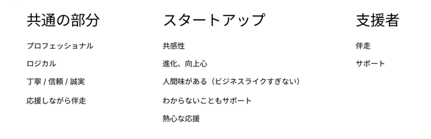福本:サービス人格、これもどこかで聞いたことのある言葉ですね。こうして並べられたキーワードを見ると、私もプロダクトに対して同じような印象を持つなあと思いました。スタートアップ・支援者・共通部分で分けて考えられたんですね。