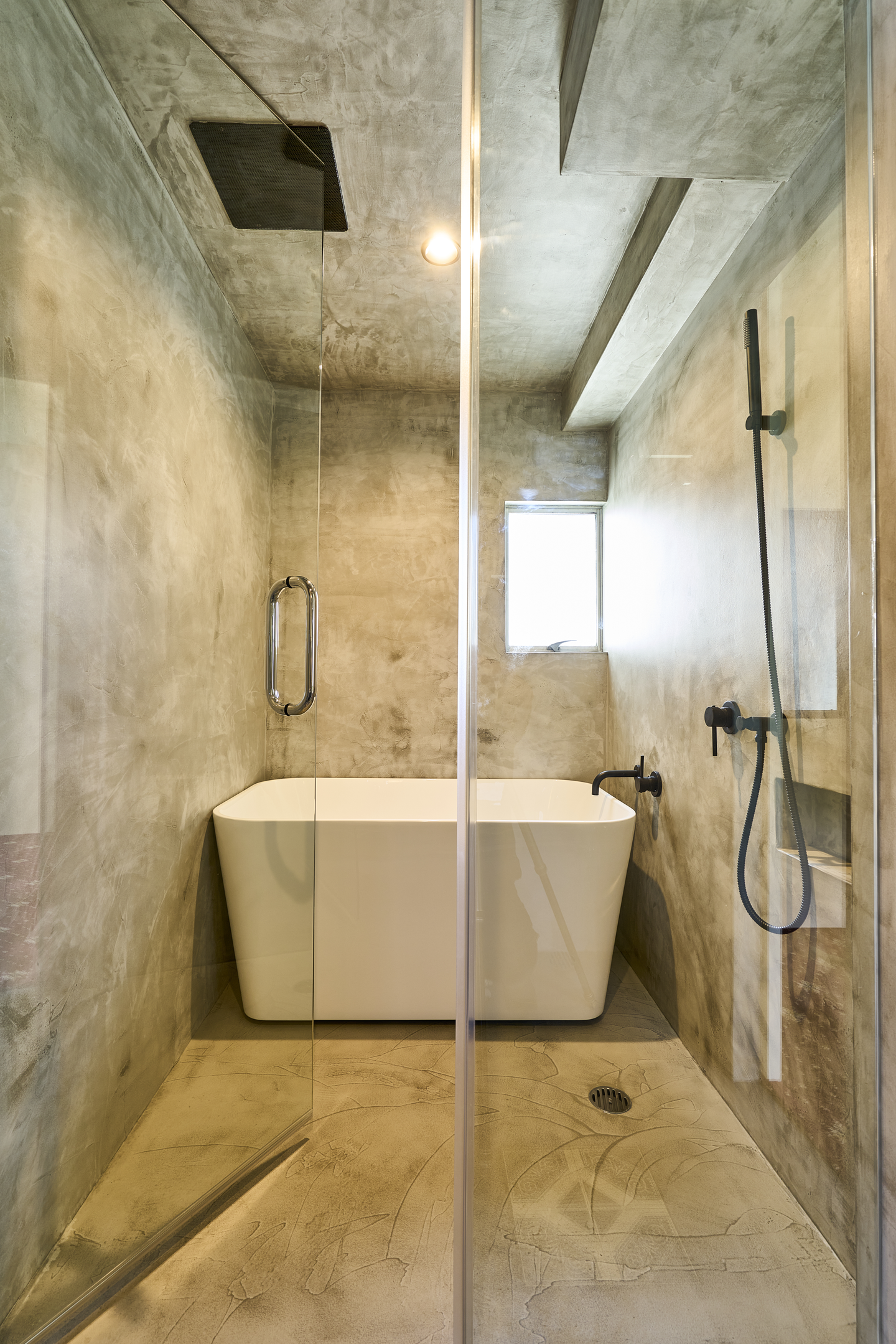 男前なバスルームは、左官職人の特殊技術によるヴィンテージ仕上げ。