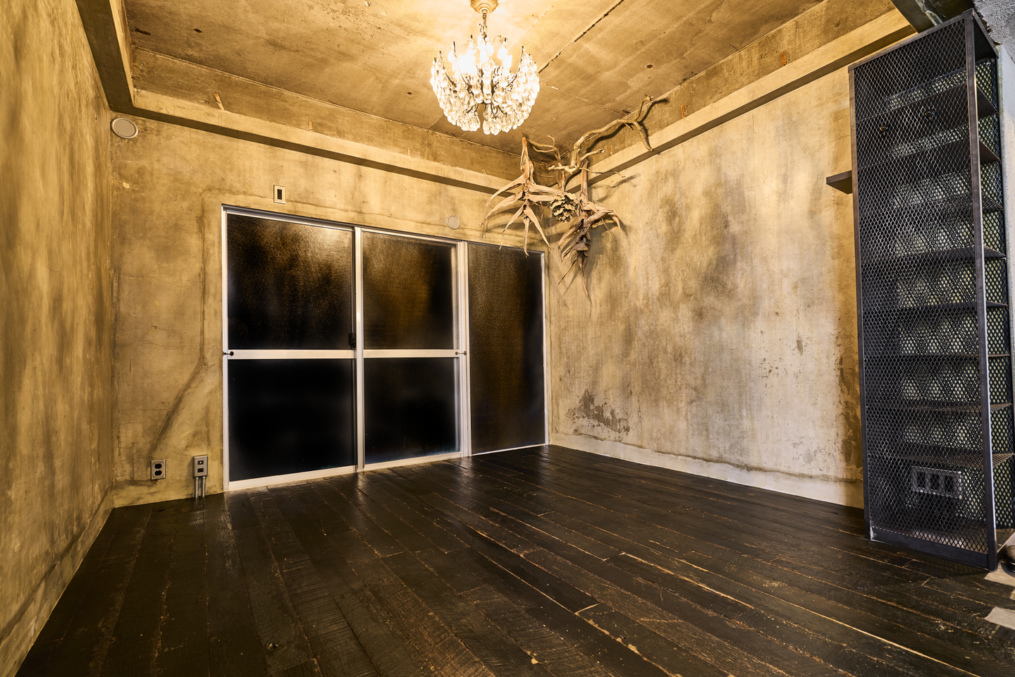 アンティークのシャンデリアで、古壁と古材フローリングが一層引き立ちます。