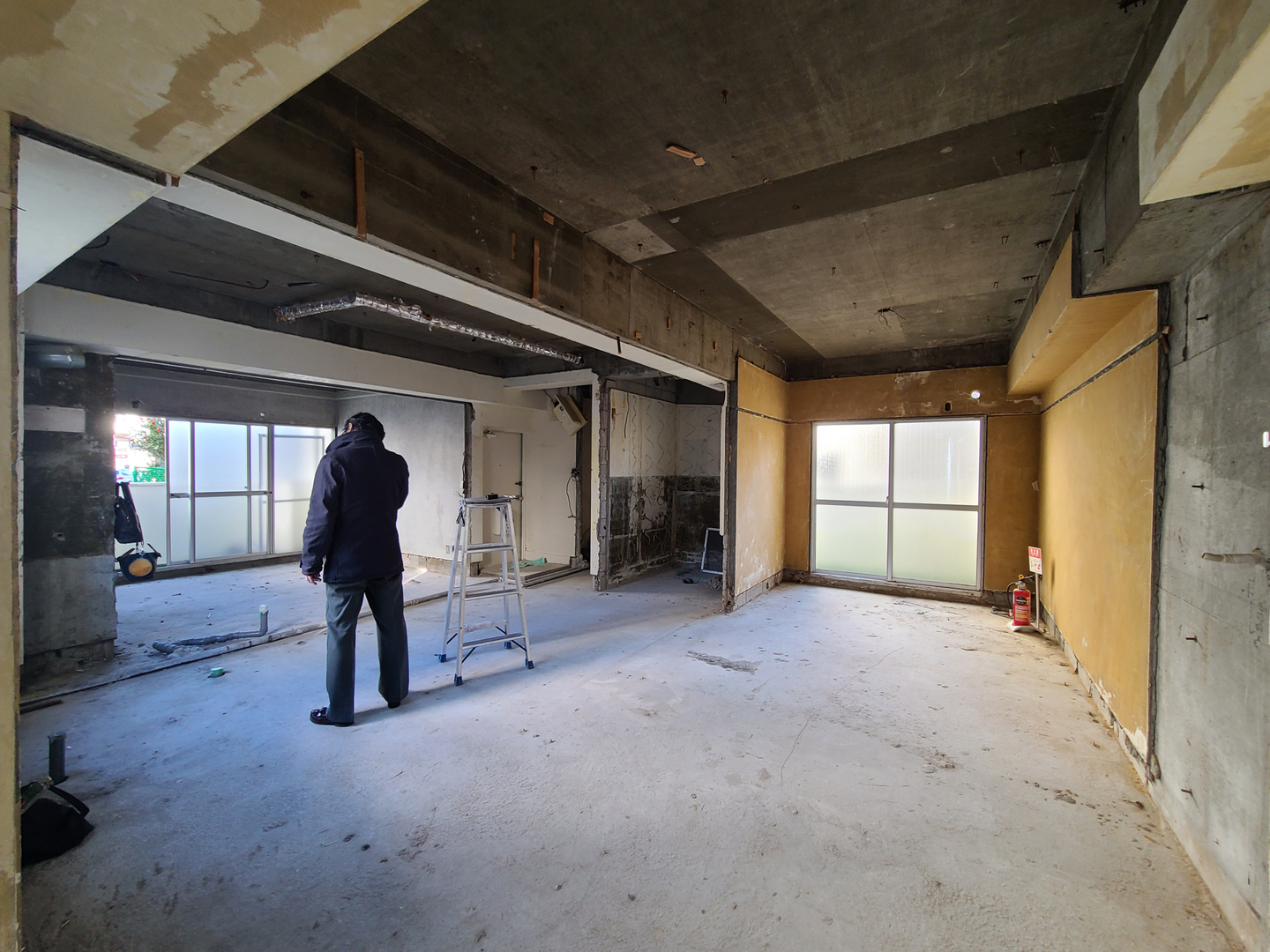 約50㎡ほどのスペースを、スケルトン状態に解体しました。どんな仕上げにしようかと