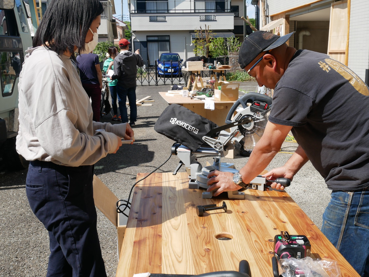 先輩社員の前川さんと木村さん。スライド丸のこの使い方をレクチャー中。