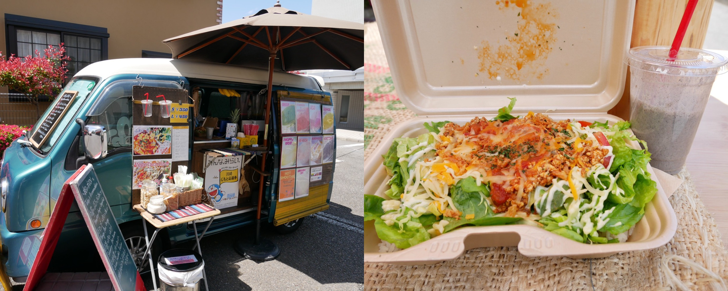 お昼はキッチンカーでタコライスを買って、ぽんぽこマルシェの皆さん、先輩社員の前川さんと一緒にランチしました。