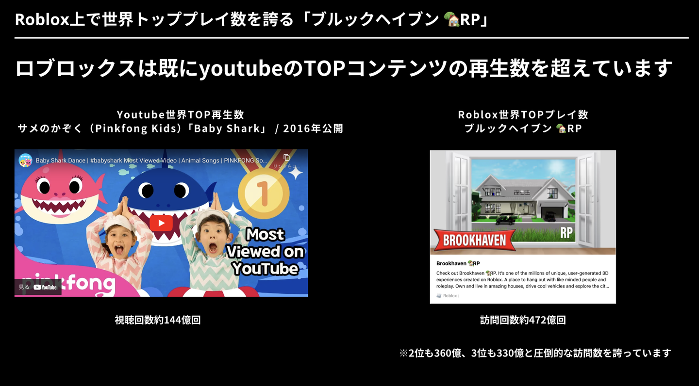 ※ ちなみに、世界で最もプレイされた多かったメタバースゲームは、延べ訪問回数が400億回以上という脅威的な数字になっています。Youtubeで世界で最も再生されている動画、「Baby Shark Dance」でも140億回(2024/1月時点)なので、メタバースの影響力の凄まじさがわかります。
