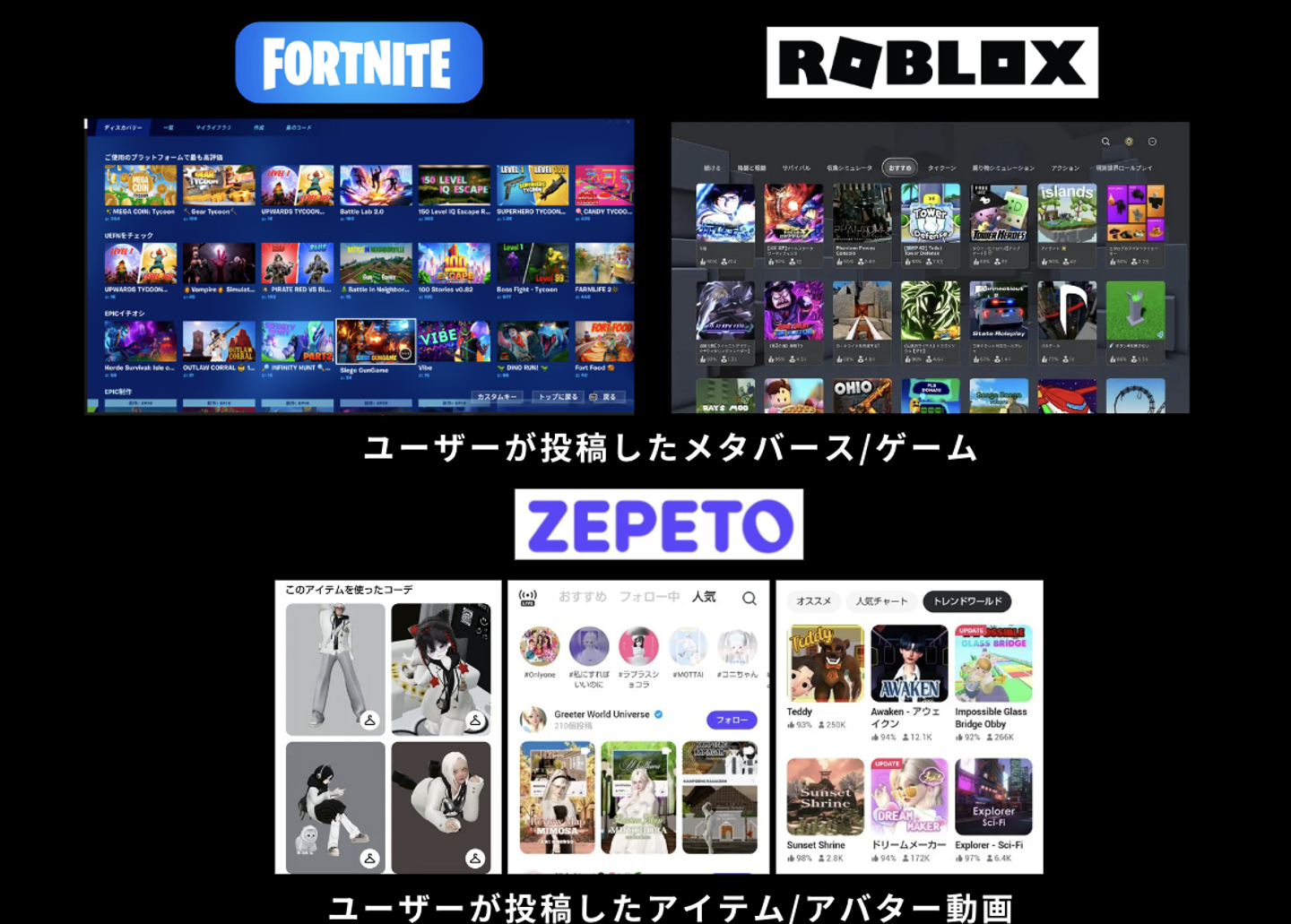 理由はシンプルで、『FORTNITE(フォートナイト)、Roblox(ロブロックス)、ZEPERO(ゼペット)』が、最終的にプラットフォームとして勝つことがほぼ明らかで、既にその中で経済圏ができ、お金が動いているからです。