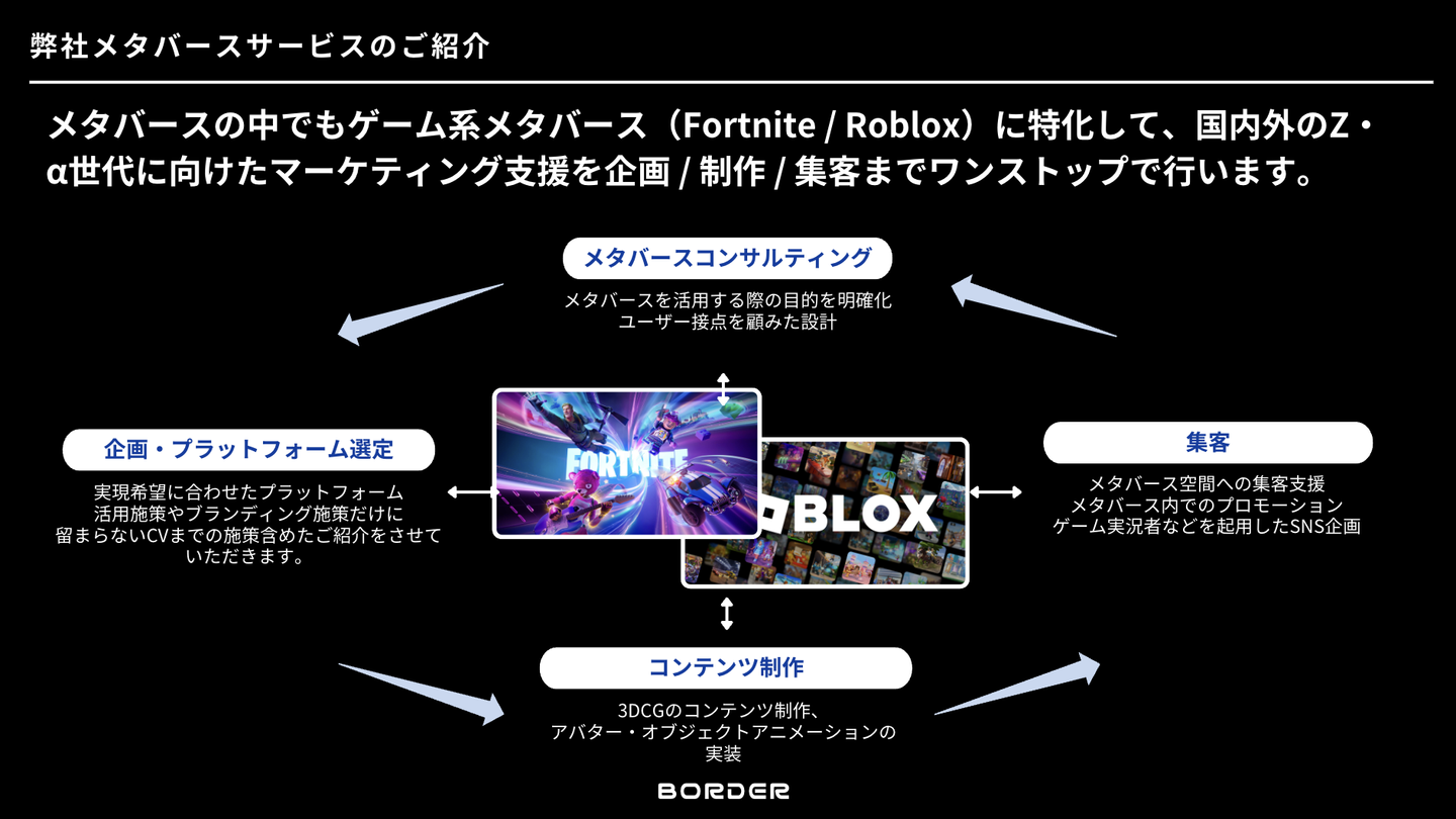 具体的には、FORTNITE(フォートナイト)、Roblox(ロブロックス)、ZEPERO(ゼペット)というゲーム系のメタバースプラットフォーム上で、企業さんのPRやブランディング、マーケティング活動を展開しています。