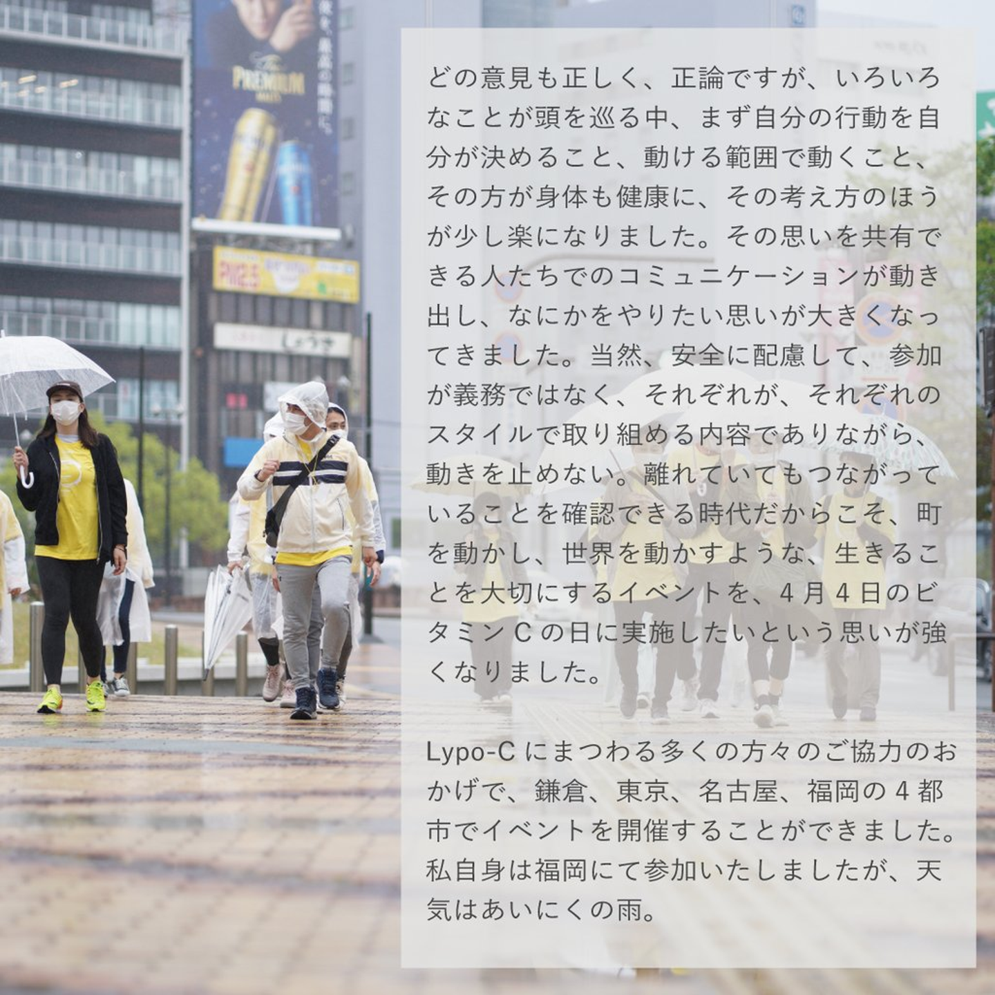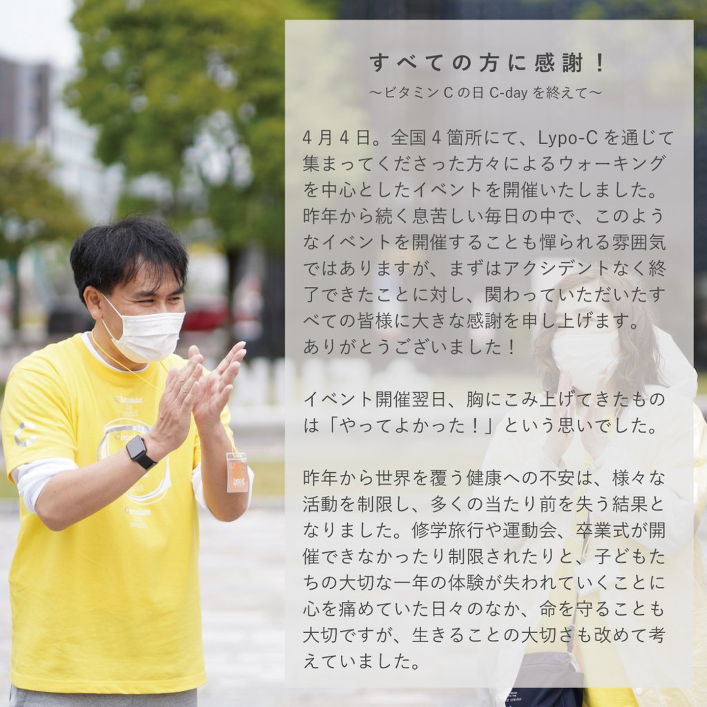 4⽉4⽇ビタミンCの⽇に「 Circulate the world ! 〜動き出そう、⾃分の⾜で〜」をテーマに鎌倉、東京、名古屋、福岡の4つの会場&オンラインにて「ウォーキングイベントC-walk!」を開催いたしました。