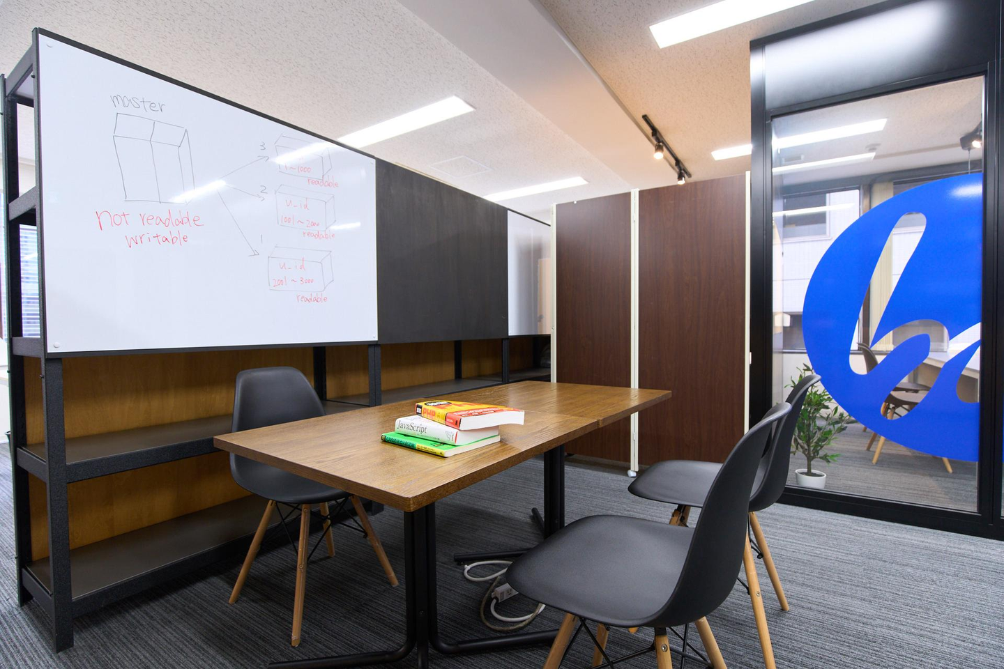 会議室の隣は開放的なスペースです。研修中はグループワークなどで使います。