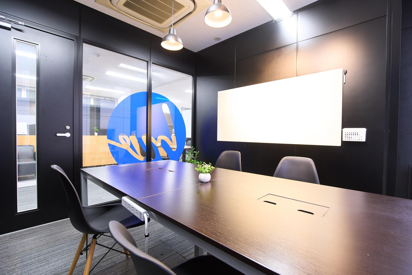 こちらは会議室です。ビヨンドワークスの青いロゴが印象的ですね。会議や研修、面接にご来社いただいた際に使用しています。