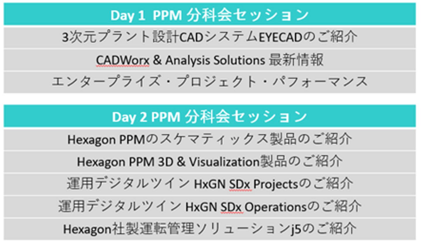 このうち、Hexagon PPM 日本オフィスは、『プラントライフサイクル全般のDX』というテーマの下、分科会セッションで以下のようなプレゼンテーションをそれぞれの担当スタッフが行いました。
