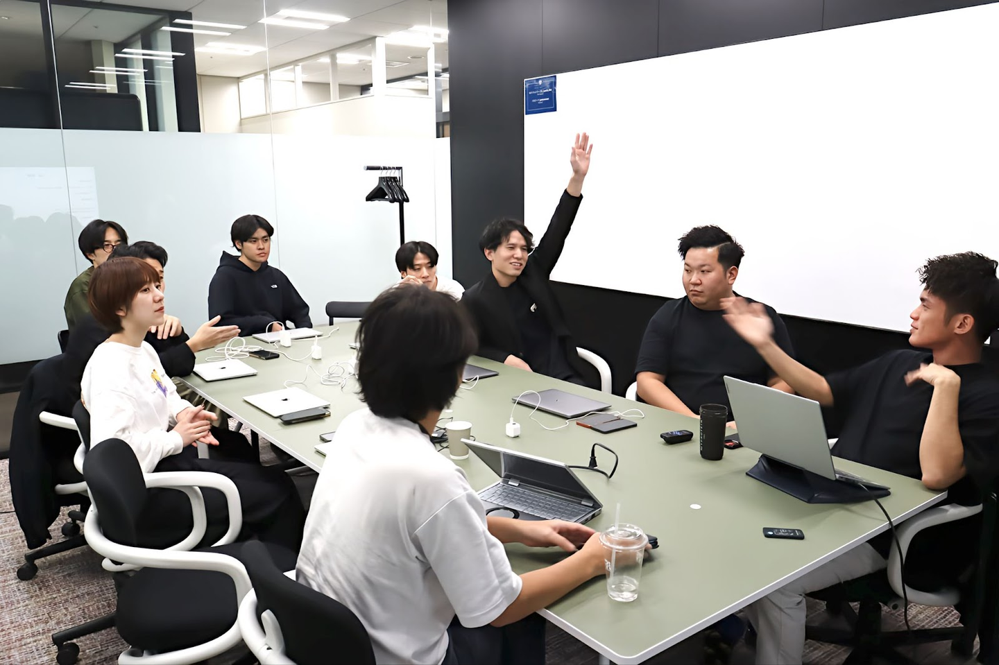 この写真は実際にメンバーが挙手して質問している様子です。フィードバックのときは真剣モードに切り替わり、シリアスな雰囲気でみんなが集中して聞いていました。