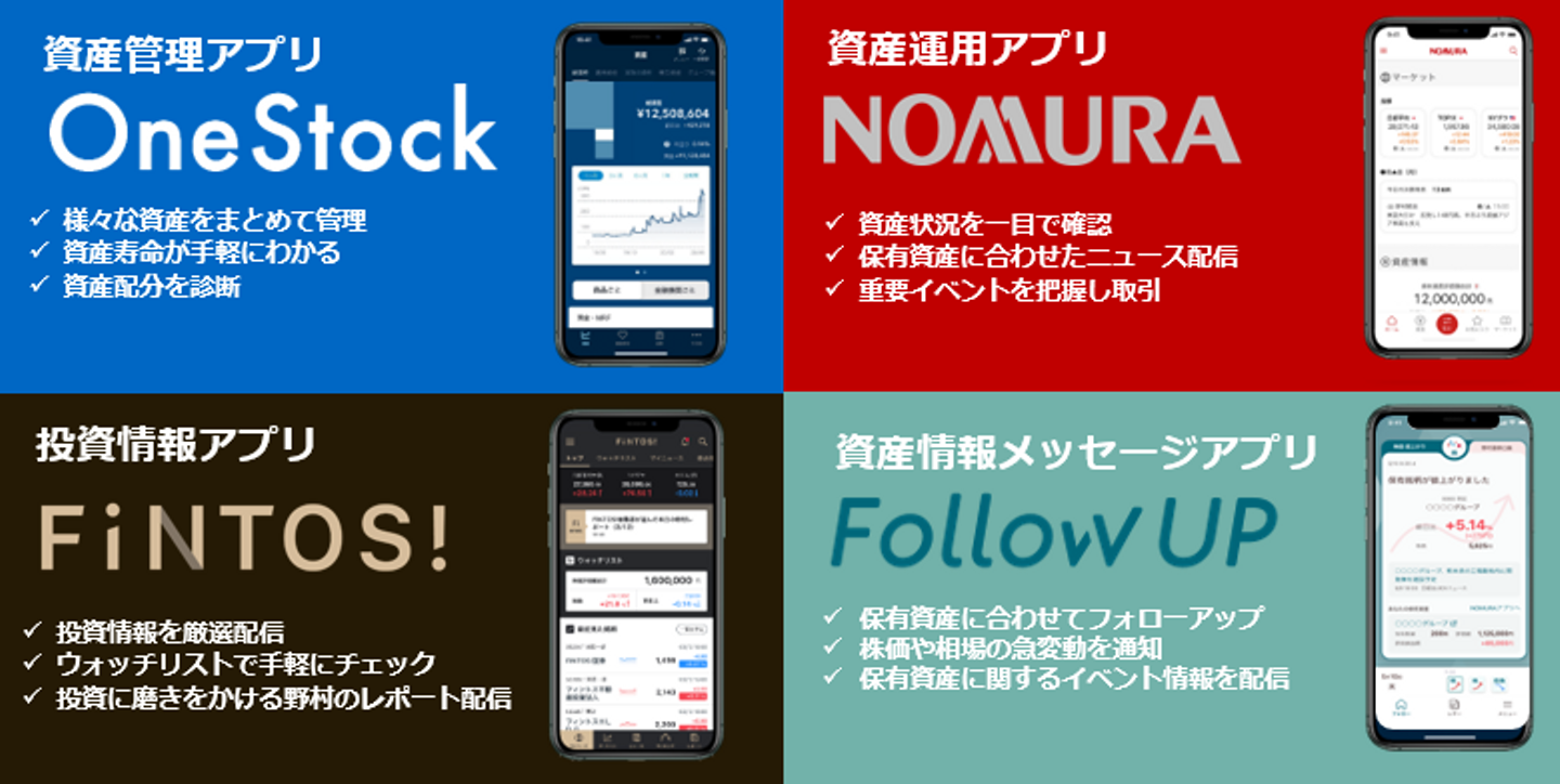 資産運用であれば、自分はどれだけ資産を持っているか、全体の資産を把握するのがスタートラインです。預金や有価証券、不動産、保険、年金、住宅ローンなどすべての資産を一元管理できる資産管理アプリ「OneStock(ワンストック)」を開発しました。理想の運用をするには情報が必要になります。そこで投資情報アプリ「FINTOS!(フィントス!)」を活用していただき、自分のポートフォリオを見直しながら資産運用アプリ「NOMURA(ノムラ)」でスムーズな取引をしていただけます。