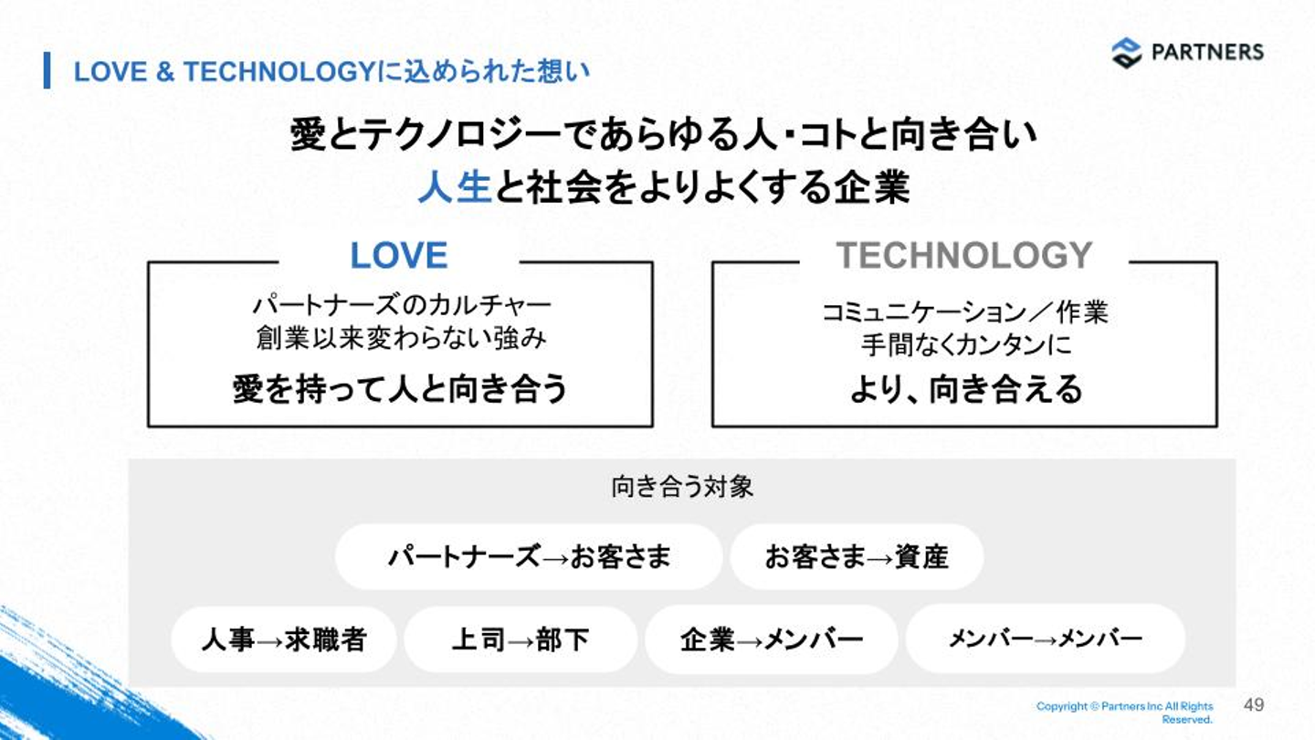また、パートナーズ独自の強みとして、ブランドメッセージに「LOVE&TECHNOLOGY」を掲げています。