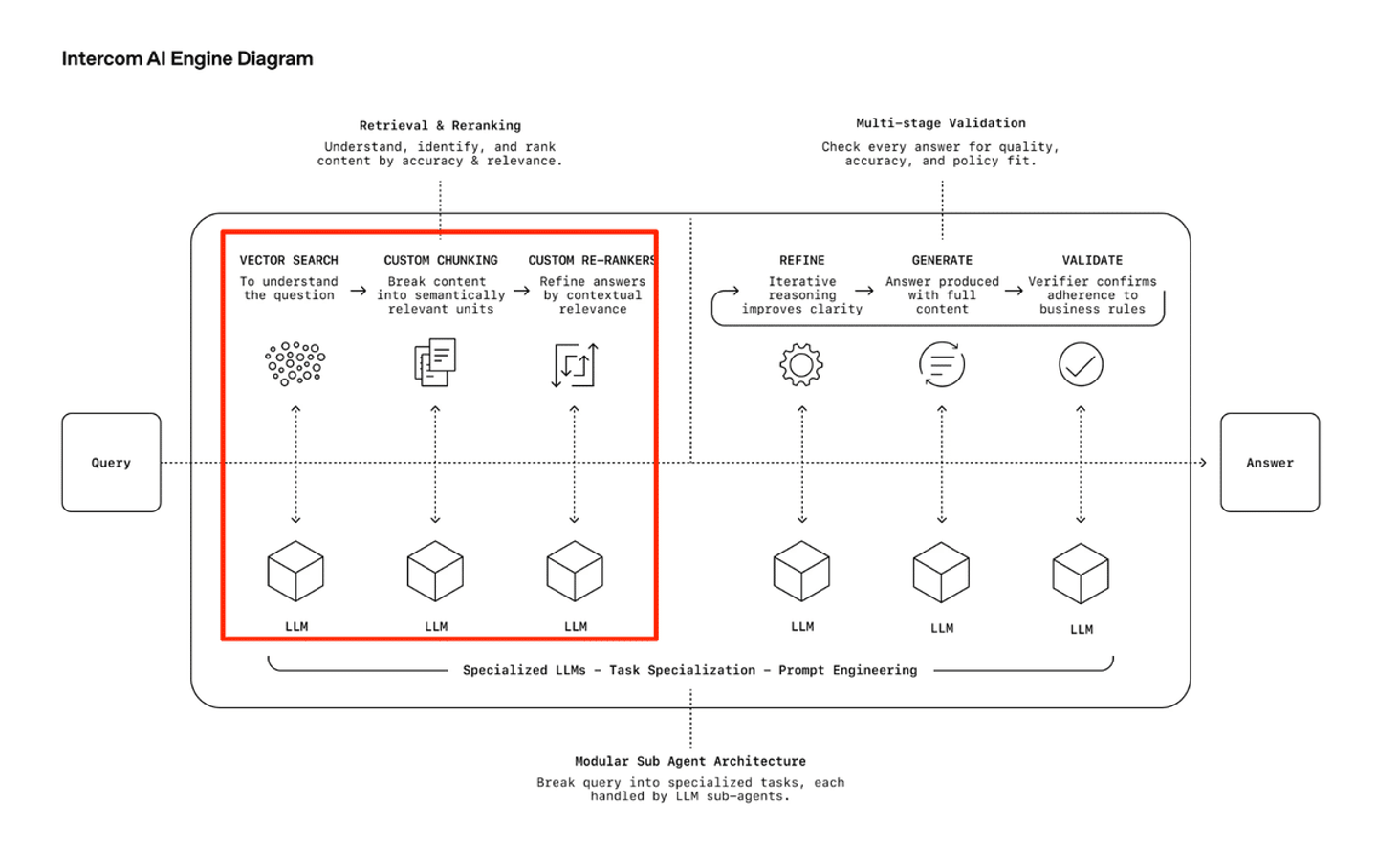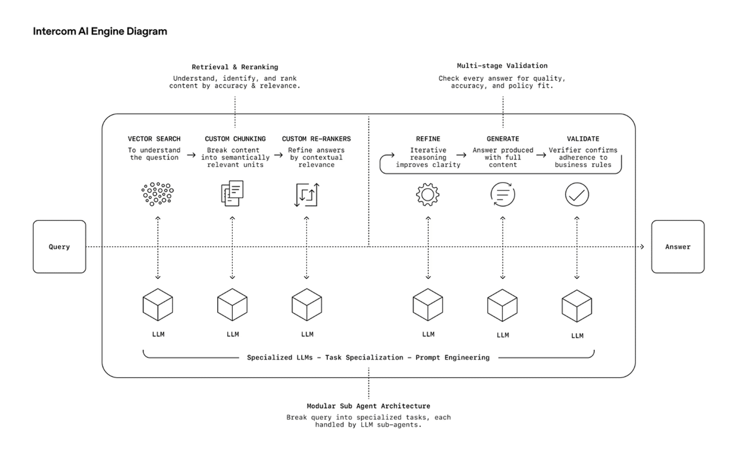 赤枠で絞った3工程も、「そもそも理解しやすい形って何?」「情報検索の仕組みは?」など、さらに分解して深堀っていくと、沼になっていくのですが、要はIntercomのAIは、質問に対して1つのLLMが一発で答えるのではなく、複数の専門AIが協力して 「理解 → 情報検索 → 整理 → 生成 → 検証」 のプロセスを踏むからこそ、文脈に沿った自然で正確な回答ができる、という仕組みになっています。