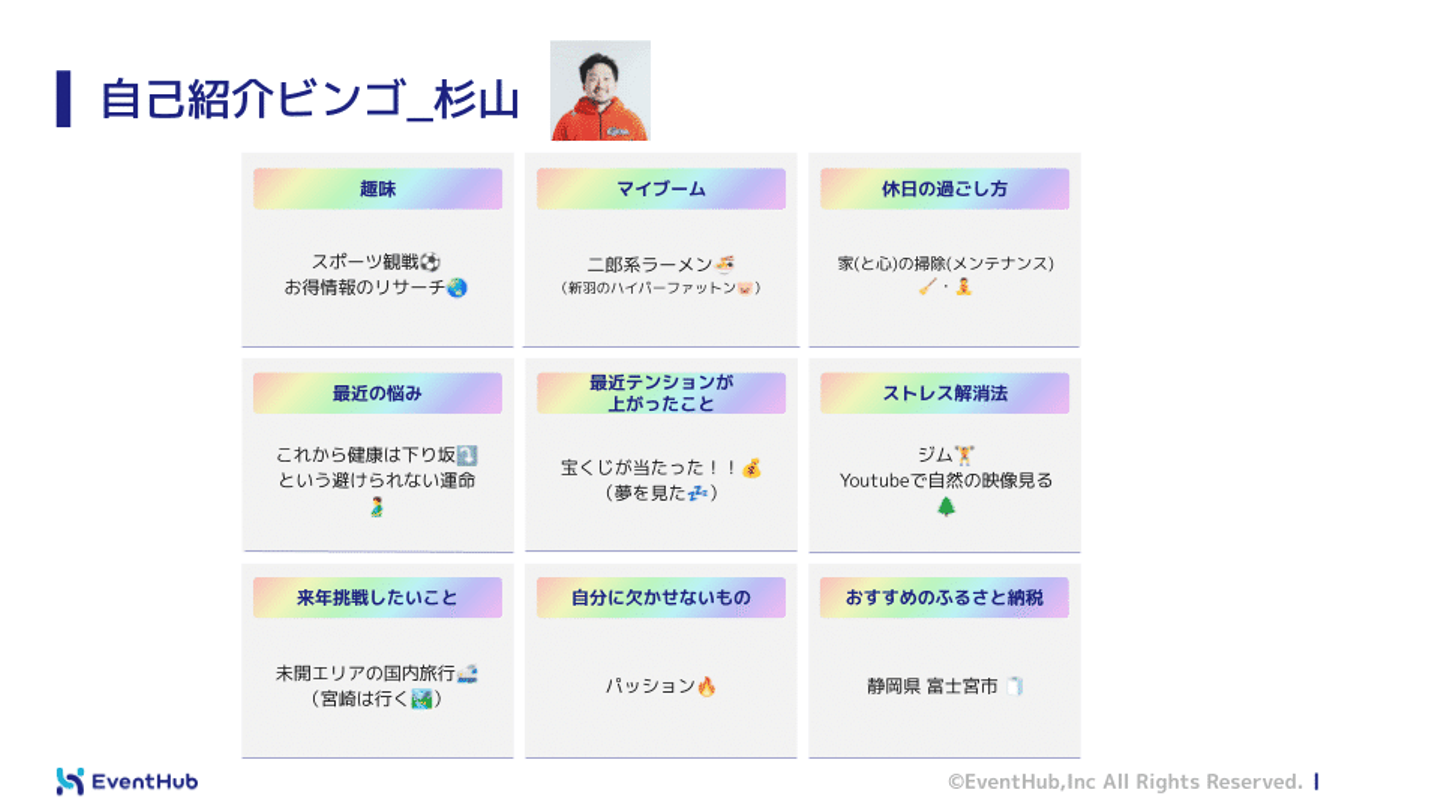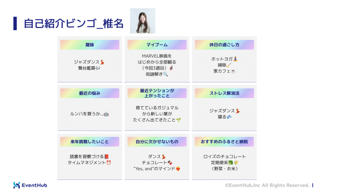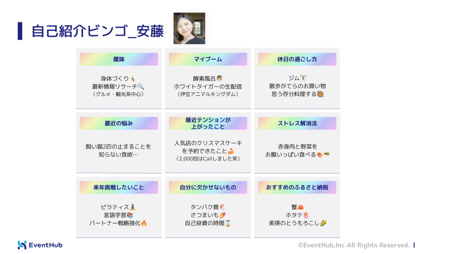 自己紹介ビンゴを記入いただいたものの、一切触れないスタイルでいきます笑 みなさま忘年会・新年会の会話のネタにぜひご活用ください♡