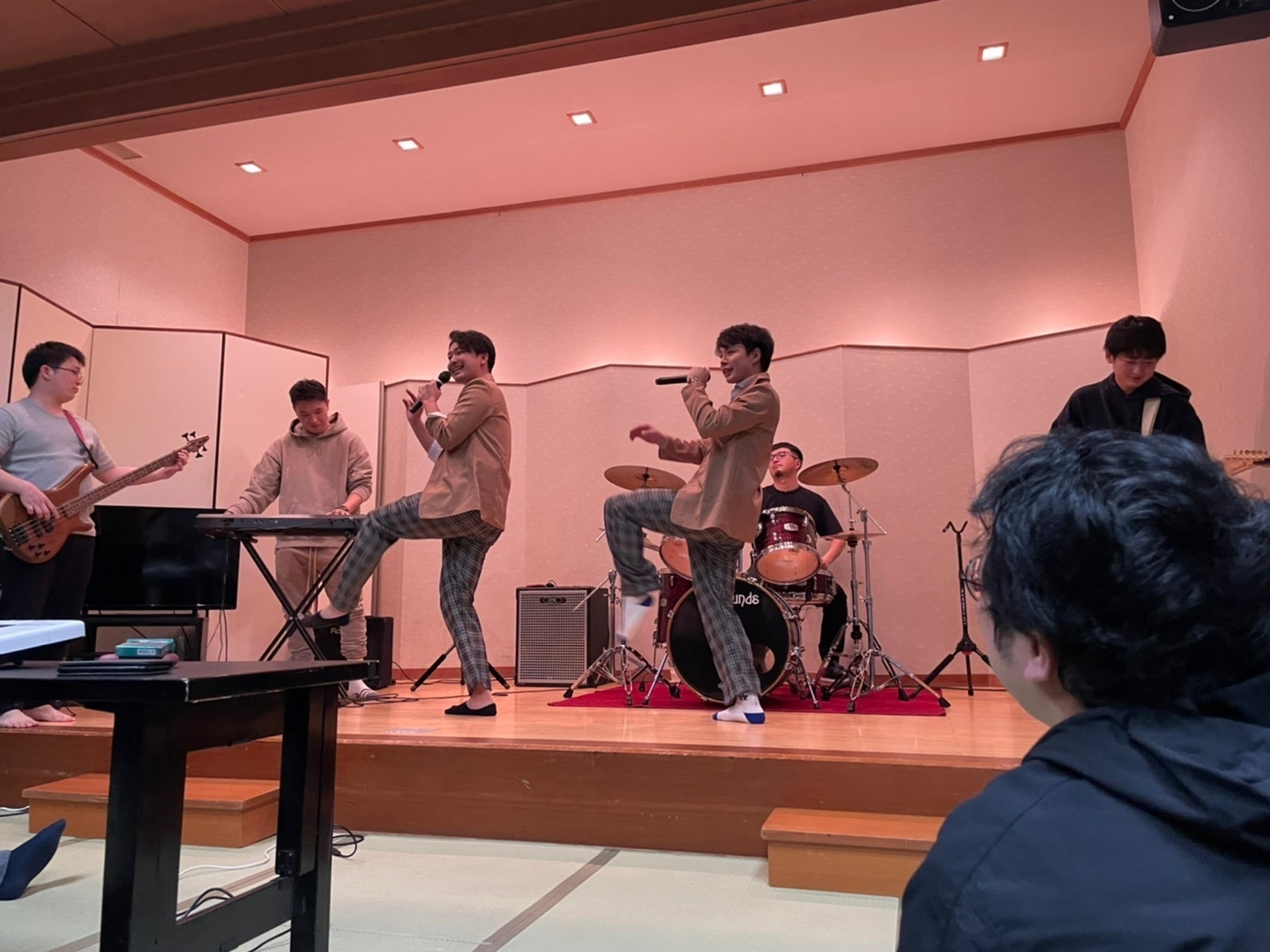 研修旅行の余興:青春アミーゴ (左)小柳さん (右)中山 バックバンドも当社社員