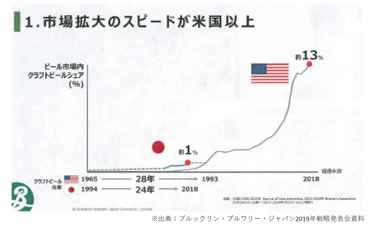そして、クラフトビール先進国のアメリカにおいては、ビール類全体に対するクラフトビールのシェアが、2018年時点で脅威の13%!日本はまだまだ1%を超えたばかりという段階にあり、とても小さい市場に感じるかもしれませんが、その成長速度はアメリカを凌ぐ勢いがあり、近い将来、少なく見積もっても3倍~5倍まで成長すると見込まれる、先行きの明るいマーケットです。