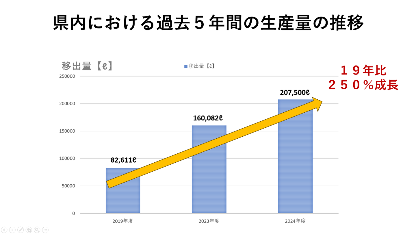 山形県内のクラフトビール市場はと言いますと、なんと、コロナ禍前の2019年度と、昨年2023年度で生産量が約2倍!今期2024年度の見込みとしては、2.5倍!と全国平均を大きく上回る伸び率です。山形県内のクラフトビール業界の”勢い”を感じます(^^♪