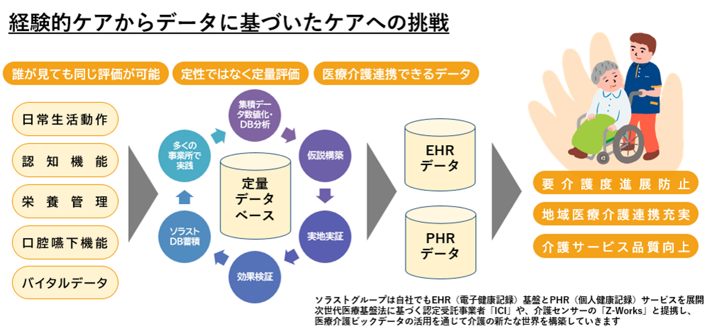 定性だらけのデータで医療と介護を線で繋いでも解析なんかできない。だから介護のデータを定量化していこう。これがソラストが目指す「科学的根拠に基づく介護」の原点です。ソラストは医療、介護、保育を展開するいわば生まれてから墓場までのすべての年代の方々とアプローチできる企業です。医療と介護の共通言語を増やし、定量項目を介護でたくさん取得することにより、医療機関から介護施設に、そしてまた医療施設に戻っても介護施設での状況をすぐにデータで把握できる環境を作れば、医療職と介護職のコミュニケーションも活発となり、医療介護連携も加速するのではないかと考えています。同時にマネタイズも考えなければなりません。地域医療連携は補助金に頼っているところが多く、自立運営できるには財源の確保が必要です。データを活用しうまくマネタイズすることで患者さんに還元される仕組みも考えていく必要があります。