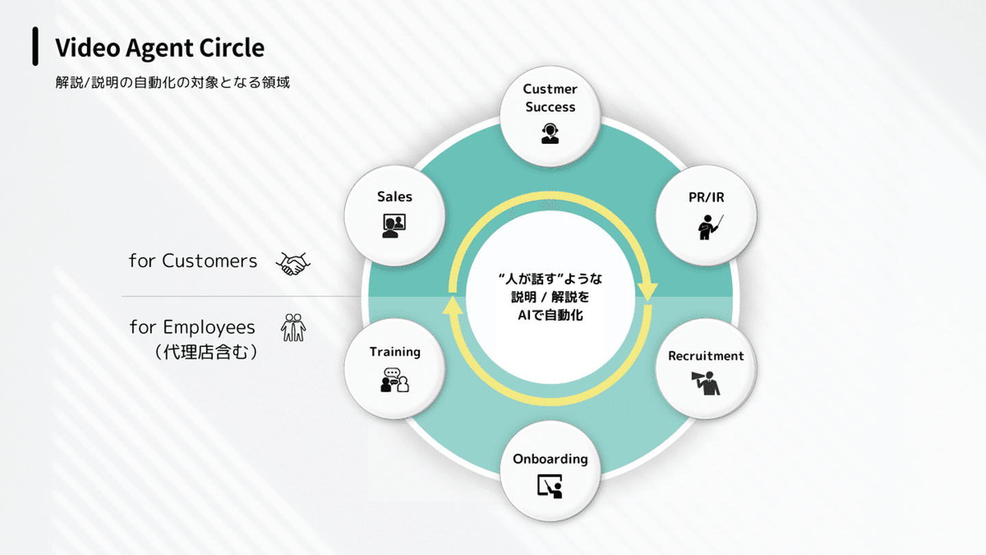 Video Agentは、AIを活用して“人が話す”ようなプレゼンテーションや解説を自動で行うソリューションです。営業資料の説明、カスタマーサポート、PR、IR活動、社員教育、オンボーディング、さらには採用活動まで、幅広い分野で活用が可能です。下記の図のように各シーンでの活用を並行して進める事によって、プレゼンテーションや解説の情報に一貫性が生れ、また、視聴者(解説やプレゼンや受ける側)の反応データやインテントデータが蓄積されるため、より効果的な情報伝達や、その後のフォローアップ最適化を実現する事ができます。