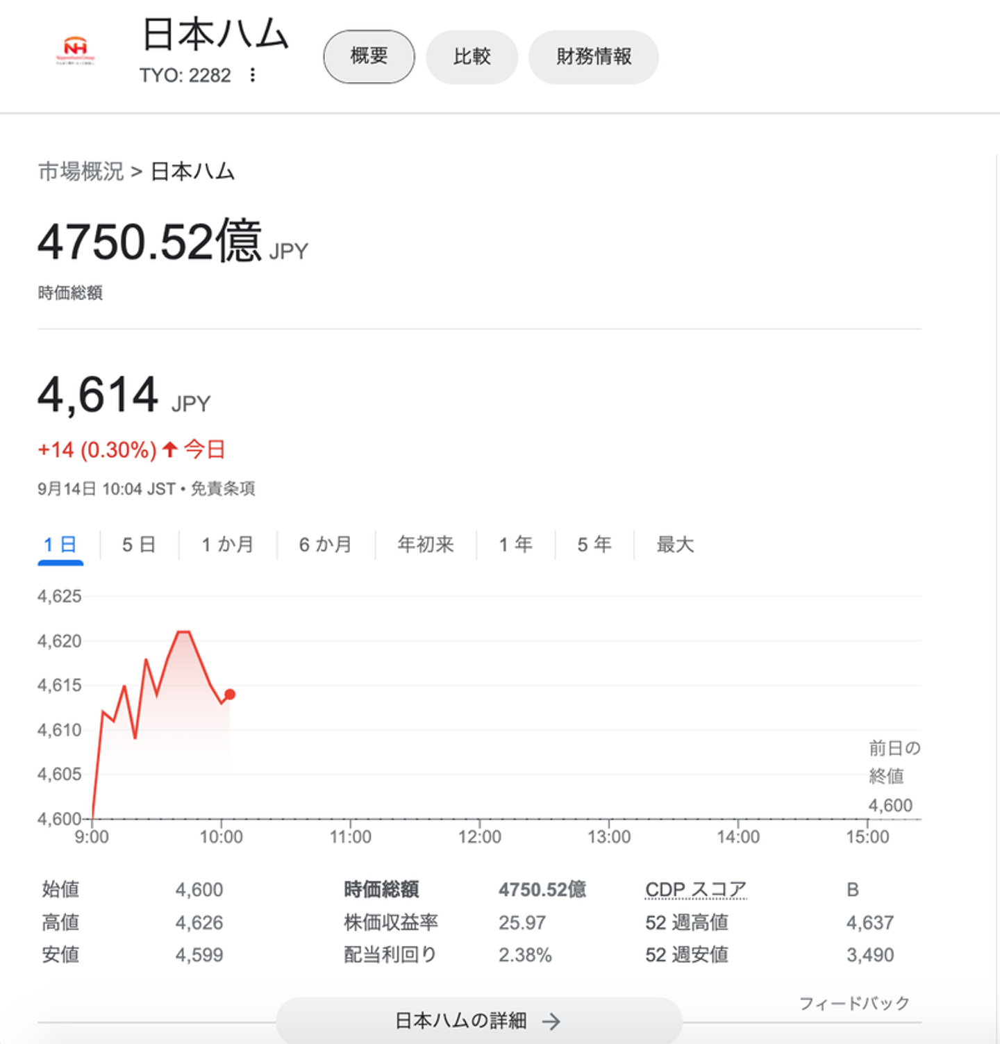 自分の実家であった精肉業界の時価総額を調べてみました。そうすると、家庭でお馴染みのシャウエッセンや日本ハムファイターズを傘下に持つ日本ハム株式会社が時価総額5000億でトップだと気付きました。