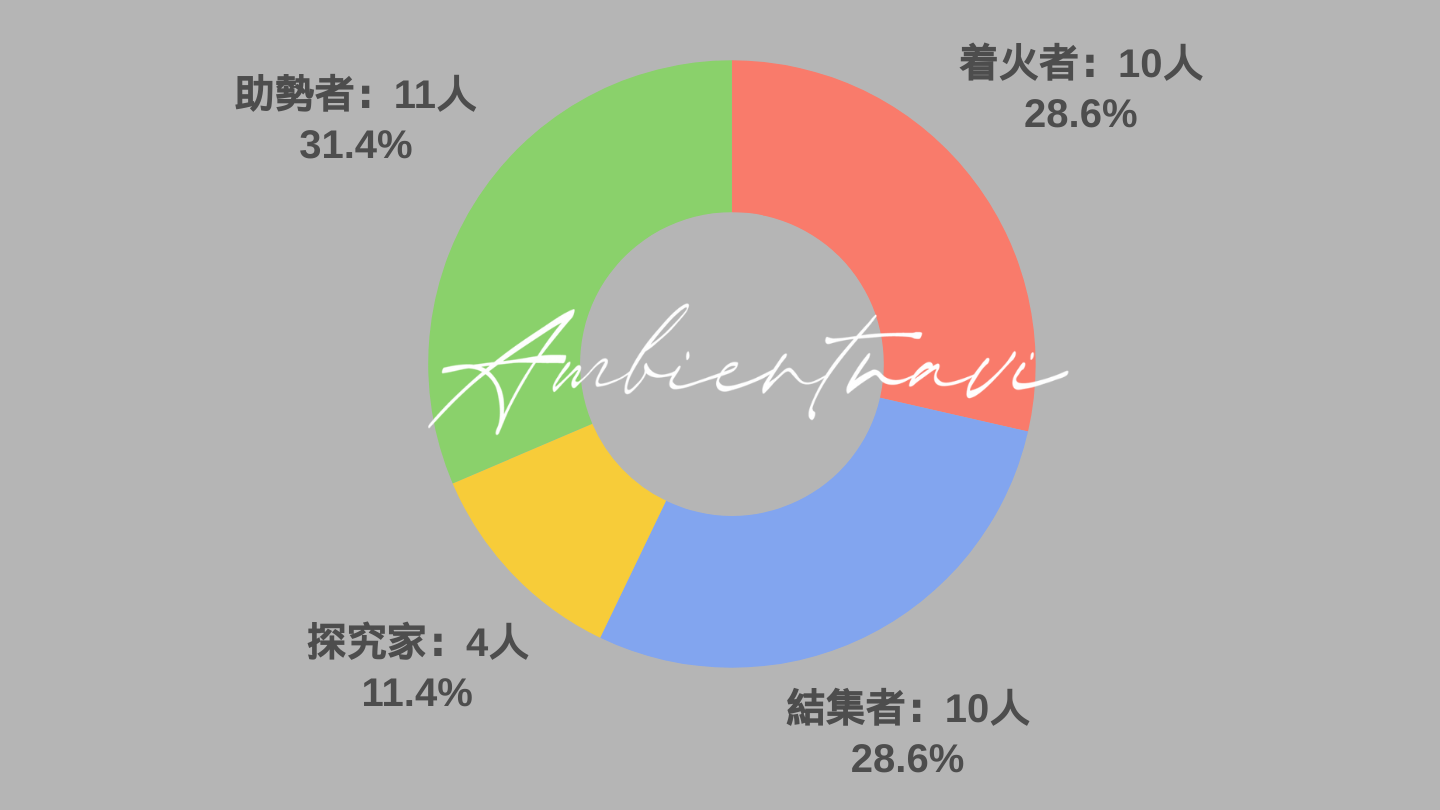 アンビエントナビ全社員の診断結果をまとめると上記のとおり。着火者/結集者/助勢者がほぼ同じ割合でいますね。昔からいるメンバーの多くは着火者と結集者が多かったのです。ここ数年は社内改革もあって、変革の時期を迎えていたアンビエントナビですが、結果として多様性が生まれバランスが整ったのかもしれません。