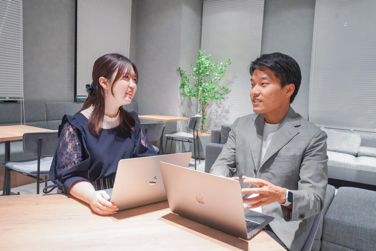 打ち合わせスペースで社内ミーティングを行ったり、仲間と語り合ったりと、光と空気が存分に入るこの場所で思い思いの時間を過ごすことができます。