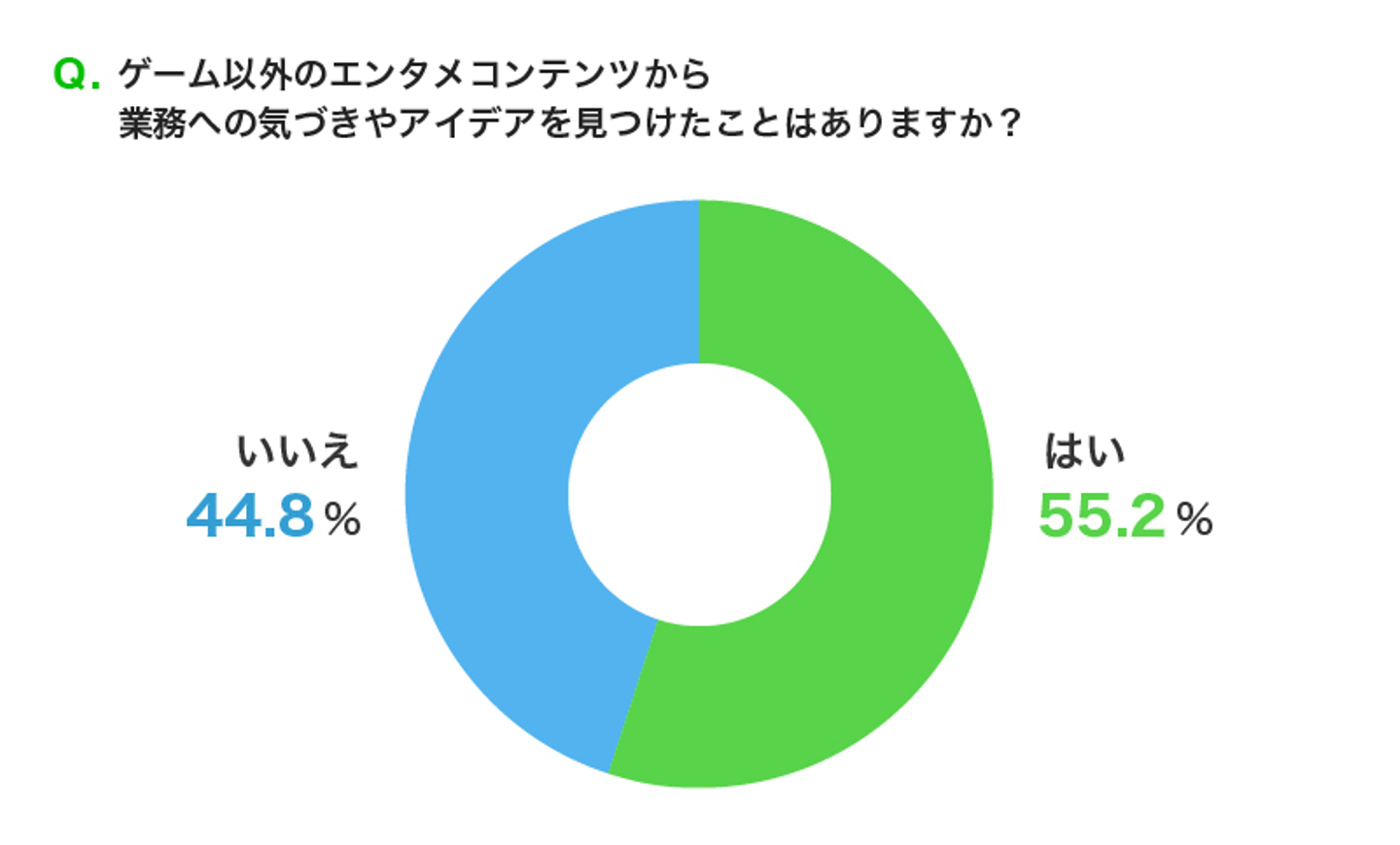 統計的には約55%のメンバーが「ゲーム以外のエンタメコンテンツから業務への気づきやアイデアを見つけたことがある」と回答。以下で数点コメントをご紹介いたします。