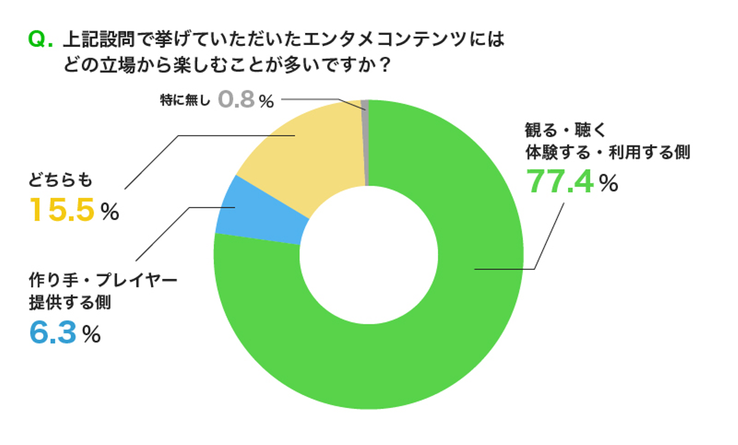 約15%のメンバーは「どちらからも楽しむ」、約6%のメンバーは「作り手・プレイヤー・提供する側」と仕事以外の時間でもエンタメ作りに熱中しているという結果も。