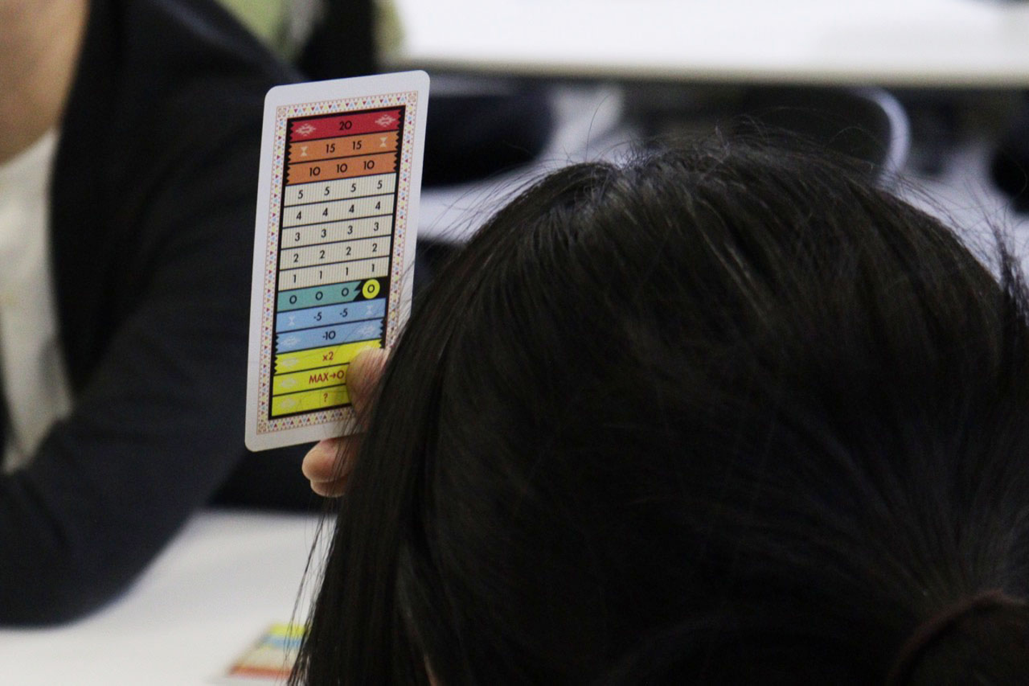 参加者が自分に配られたカードを他の人にだけ見えるように頭の上に掲げ、各々の数字を見せ合って参加者全員の数字の合計を予想するゲーム。自分の数字だけが見えないので、他の人の反応を伺いながら時に堅実に・時に大胆に数字予想をコールするという駆け引きも大事なゲームです。