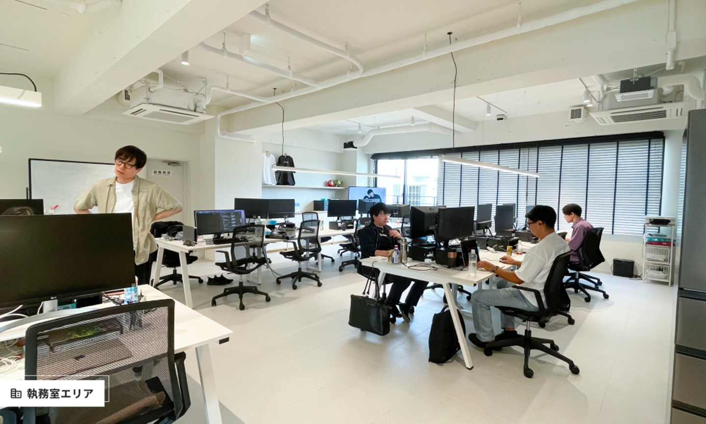 広さはなんと、旧オフィスの3倍以上に!3つの会議室に加えて個室ブースも新設され、より快適に開発に取り組むことができる環境が整いました。オフィスは原宿駅から徒歩7〜8分、東郷神社近くのオフィスビル7階にあり、このフロア全体がGenAiのオフィスです。