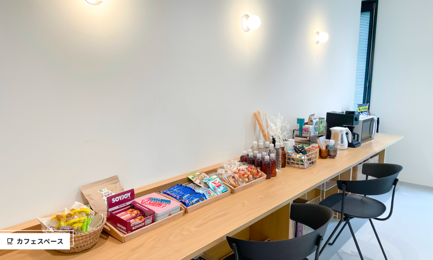 フロアの一角には、カジュアルに雑談できる休憩スペースも設けています。GenAiでは福利厚生の一環として、毎月月初に好きなお菓子を買える「GenAi Choice The Okashi」というイベントを開催。このカフェスペースには、メンバーのお気に入りお菓子や、お土産、コーヒーなどのドリンクが並んでいます。
