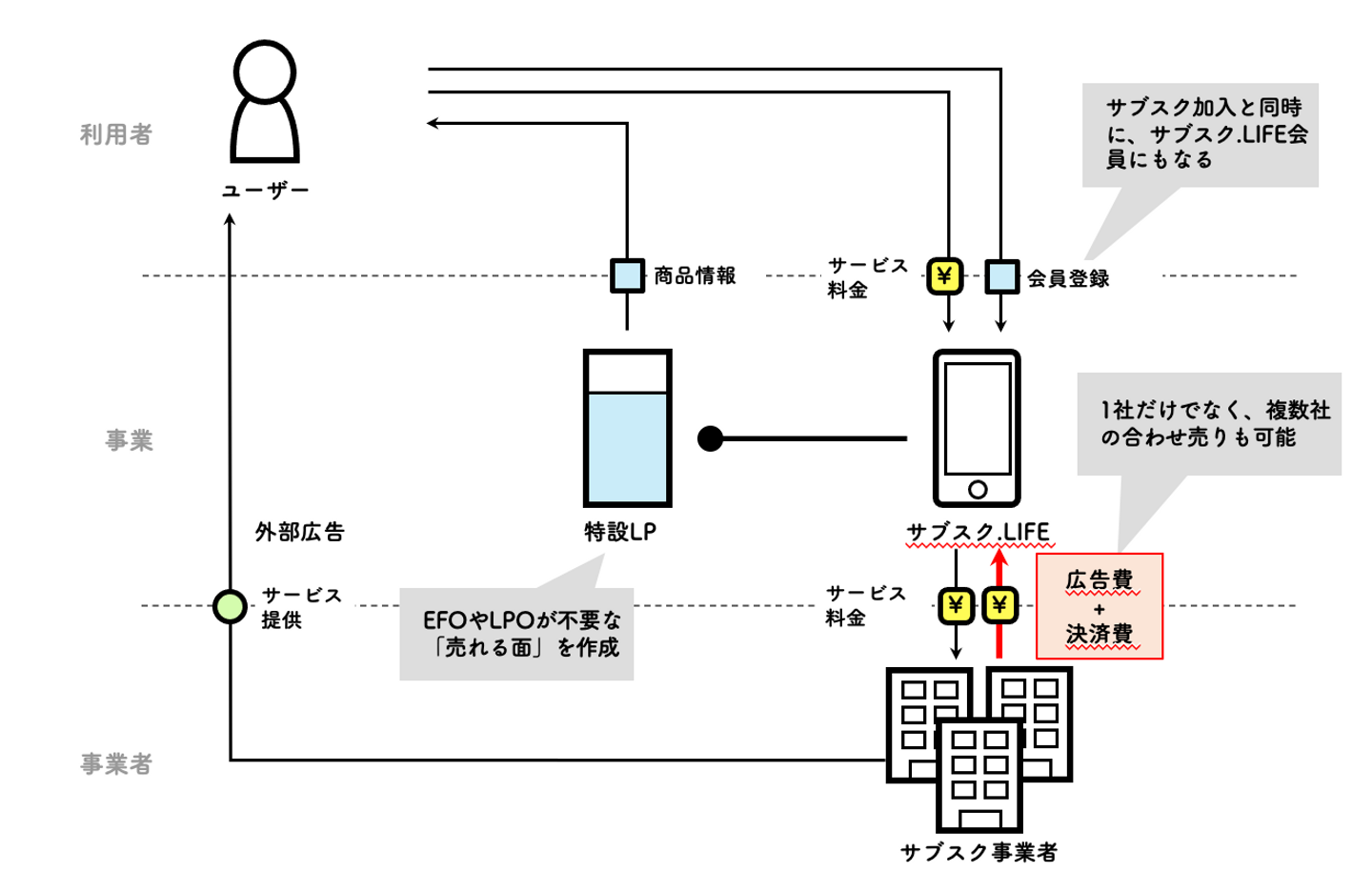 物販ビジネスにおけるモール(Amazonや楽天市場)と同様のビジネスモデルになります。サブスク商品の決済手数料と広告宣伝費を頂く形式です。弊社では広告代理店機能も兼ね揃えているため、特設ページを作ることで、特定のサブスク商品を「解約が絶対にできる」形でお試しキャンペーンとして販売していただく事になります。一見すると事業者に不利なキャンペーンにも見えますが、世界サブスク大手のNetflixがとっているブランディング戦略であり、自社ページの解約導線作り込みなしで手軽に消費者ファーストのブランド確立ができる場として活用できます。
