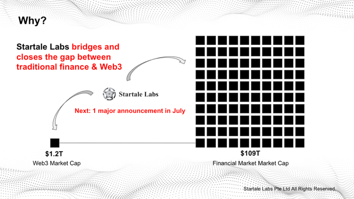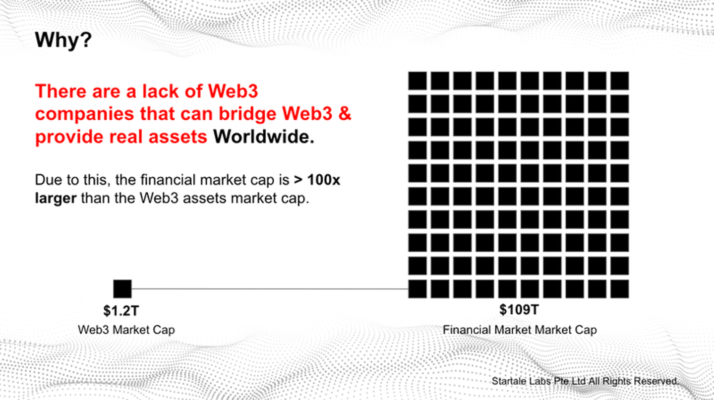 Web3のマーケットキャップは100兆円くらいなのですが、既存金融のマーケットキャップは10京円とかです。約100倍くらいサイズが違います。既存金融のアセットをオンチェーンにもってくることができればよりマスアダプションに近づくことは間違いありません。これは実際に行うにはラインセンスとか規制の問題にあたるのでとても難しいですし時間がかかると思います。