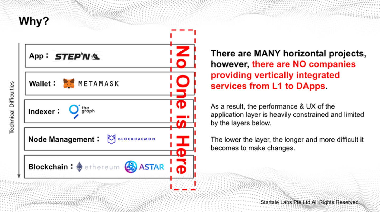 わかりやすくいうと、バンパーの専門家、エンジンの専門家、ボンネットの専門家はいるんだけど、車を作る専門家がほぼいないということです。Web3は下から雑に言って、ブロックチェーンレイヤー、ノードマネジメントレイヤー、インデックサーレイヤー、ウォレットレイヤー、アプリケーションレイヤーがあります。各ドメインにおいて専門家はおりそれぞれ一兆円プレーヤーになっています。水平分業においては問題ないのですが、垂直統合でサービスをもっている会社がほとんどいないので最終的に提供できるアプリケーションレベルでのサービスが十分に使いやすいものができないというのが現状だと認識しています。そのため、アプリが強く下のレイヤーの制約を受け、それを解決するリクエストをアプリ作成者が出してもリレー的に下のレイヤーの開発者に伝わり、それぞれにおいて別の事業プライオリティがあるので、一つのAPIを開発するのに数ヶ月かかるみたいな事態になっています。例えるなら世界一のボンネット、世界一のエンジン、世界一の部品を組み合わせても規格やサイズが違ったら世界一の車にはならないということです。どんなに優れたエンジン作っても優れた車を作らない限り人々はエンジンの恩恵を受けないわけです。