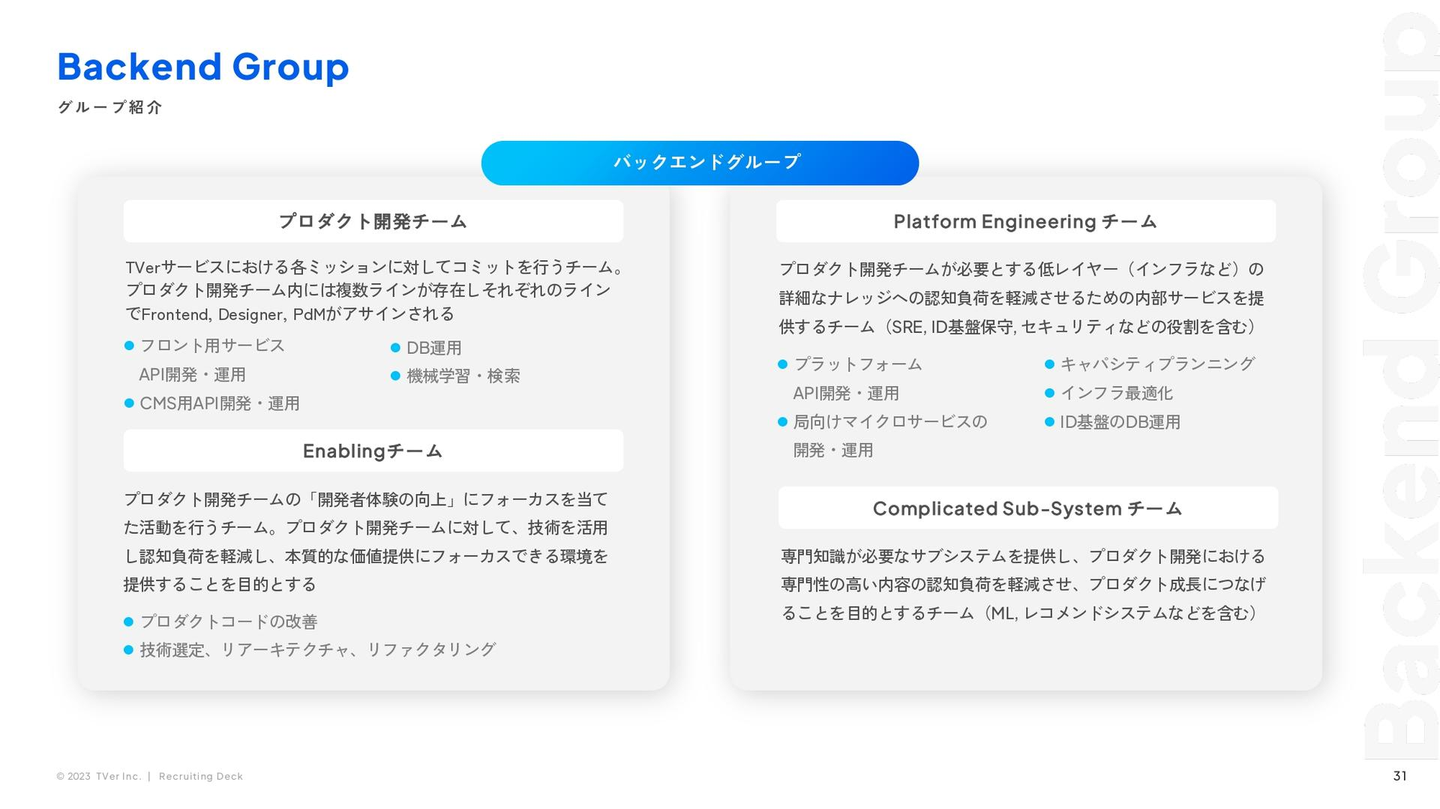 バックエンド部は、バックエンドメンバーの増員に伴い、2024年4月より現在の体制になりました。部としてまだ動き出したばかりの状態ですが、さまざまな取り組みを始めています。