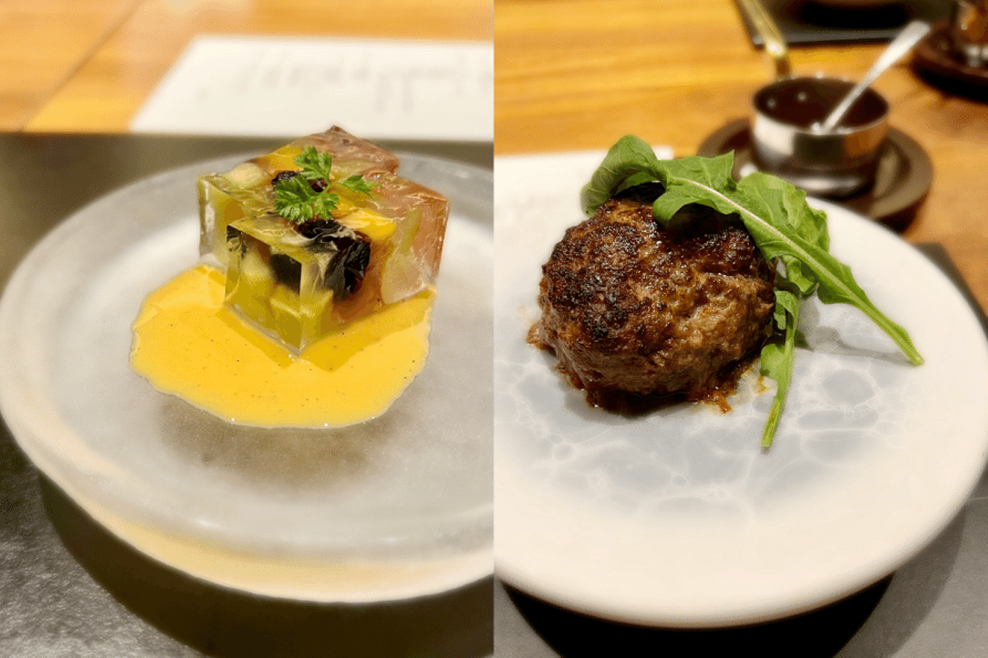 集合写真に加えて、ハンバーグと、季節のフルーツゼリー寄せアングレーズソースがけのお写真も添付いたします!!」