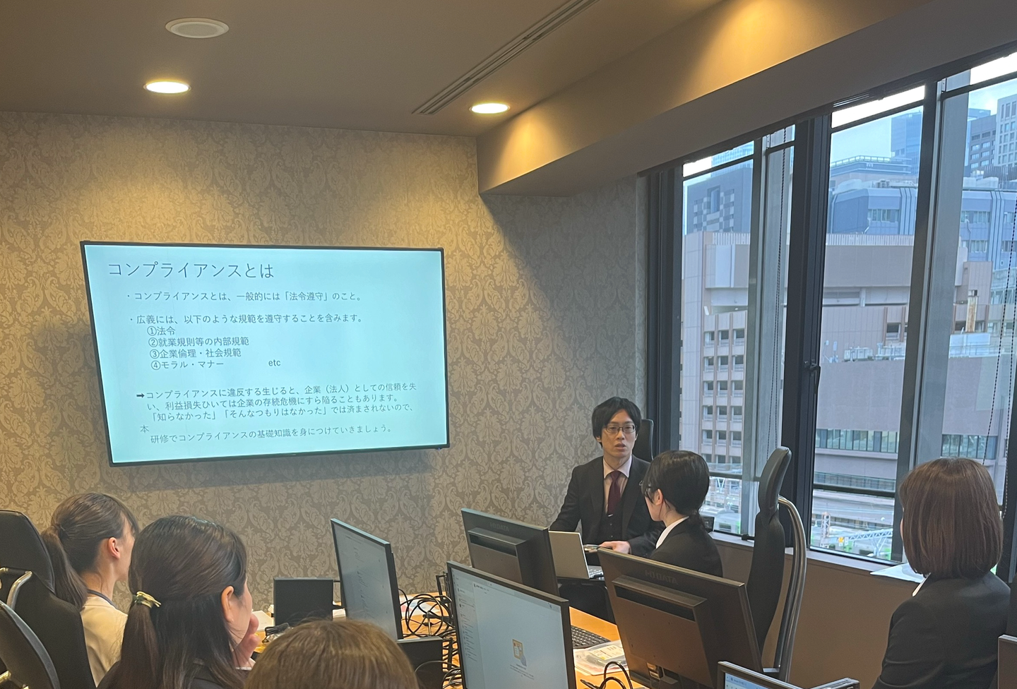 弁護士よりコンプライアンス研修を実施し、守秘義務や様々なハラスメントについて、実例を交えた講義を聞いて頂きました。入所早々に重い内容ではありますが、業務の中で戸籍や住民票等の個人情報を多く取り扱うため、しっかりと学んで頂きます!
