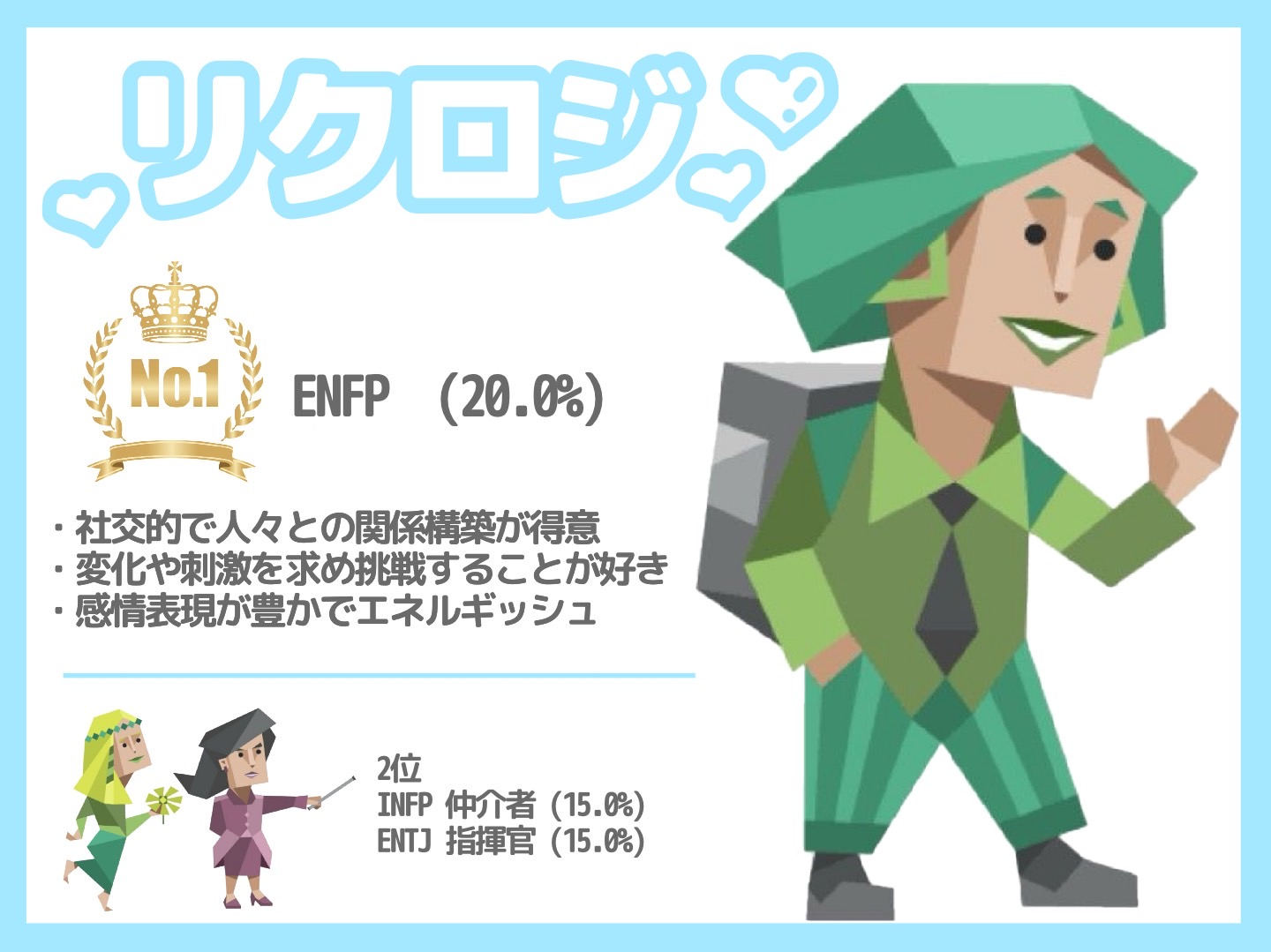 1位 ENFP(運動家) 2位ENFJ(主人公) 3位ENTJ(指揮官)となりました✨