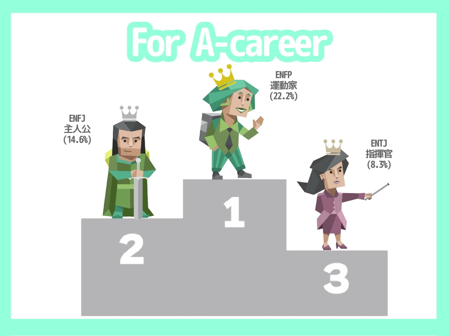 1位 ENFP(運動家) 2位INFP(仲介者) 2位ENTJ(指揮者)