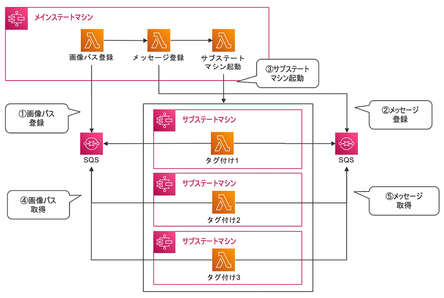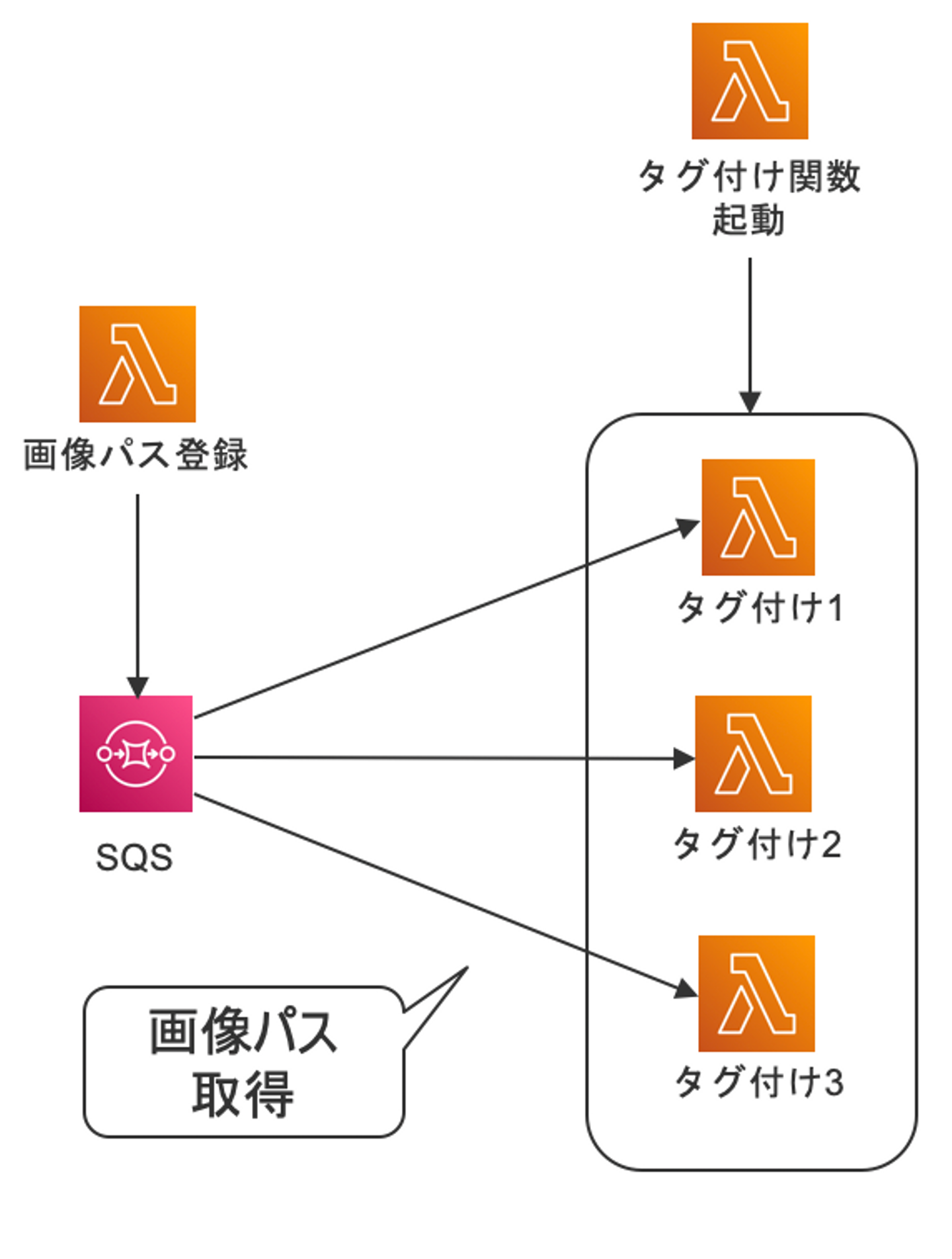 SQSに画像のパスを登録し、複数同時起動したLambdaがSQSから画像のパスを取得し、パスから取得した画像に対してタグ付けを行います。ここではLambda関数の起動にSQSトリガーは用いず、画像パスをすべて登録した後、別のLambda関数からタグ付けの関数を起動するようにしました。