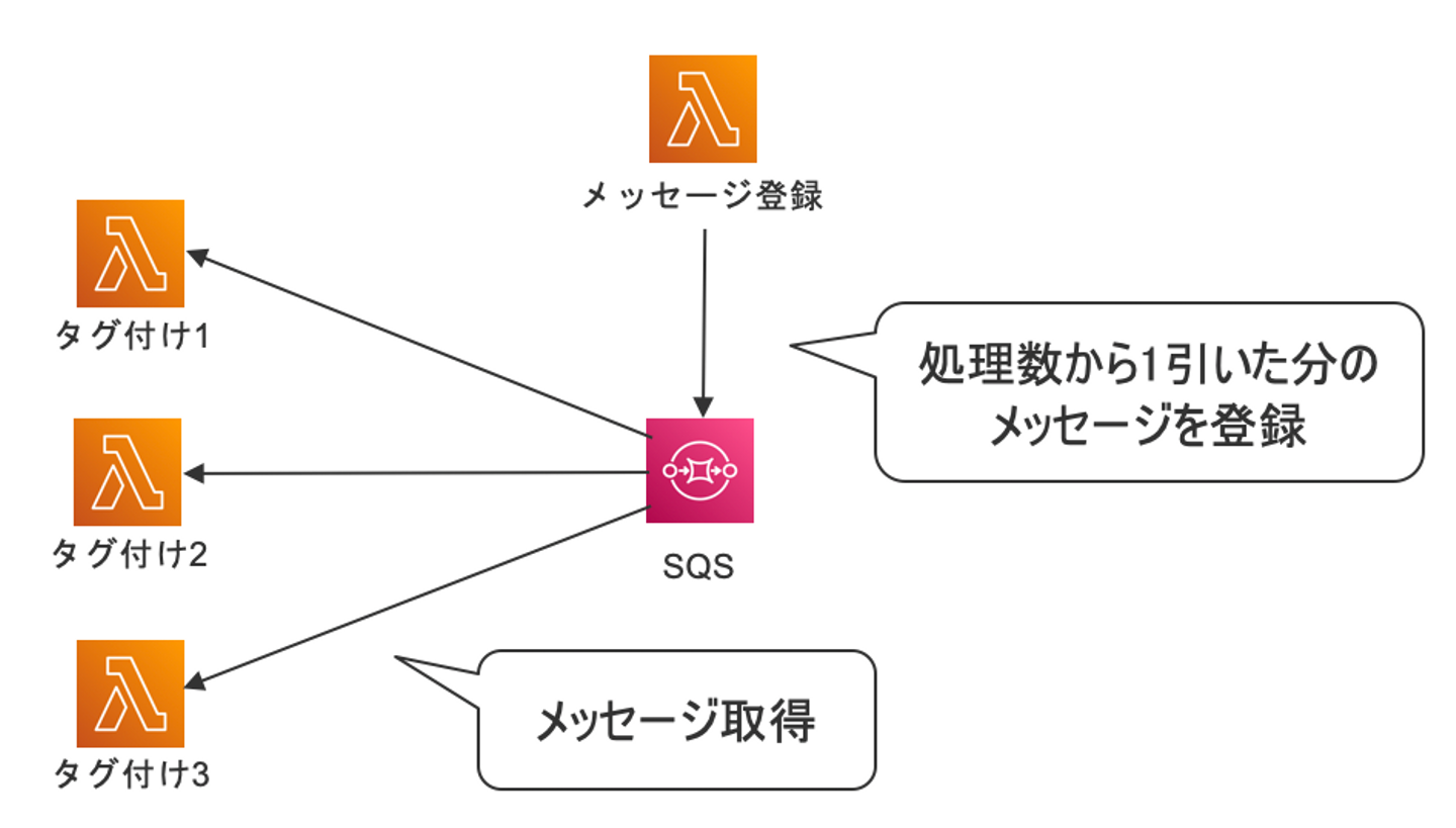 タグ付けを実行する前に同時起動数から1を引いた分のメッセージをSQSに登録します。メッセージ自身は情報を持たず、タグ付け処理はメッセージが取得できたらSQSから削除し、取得できなければ後述するコールバックを行います。