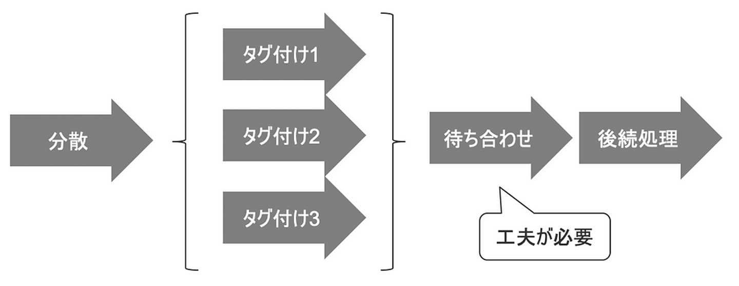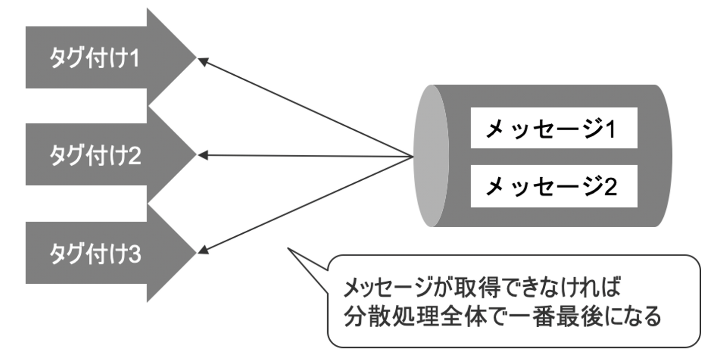 その判断をするための手段として、分散した処理の数から1を引いた分のメッセージを用意します。タグ付けを終えたらメッセージの取得を試み、既にメッセージが存在しなければ分散処理全体で一番最後の処理となるため、後続処理を実行するためのアクションを行います。