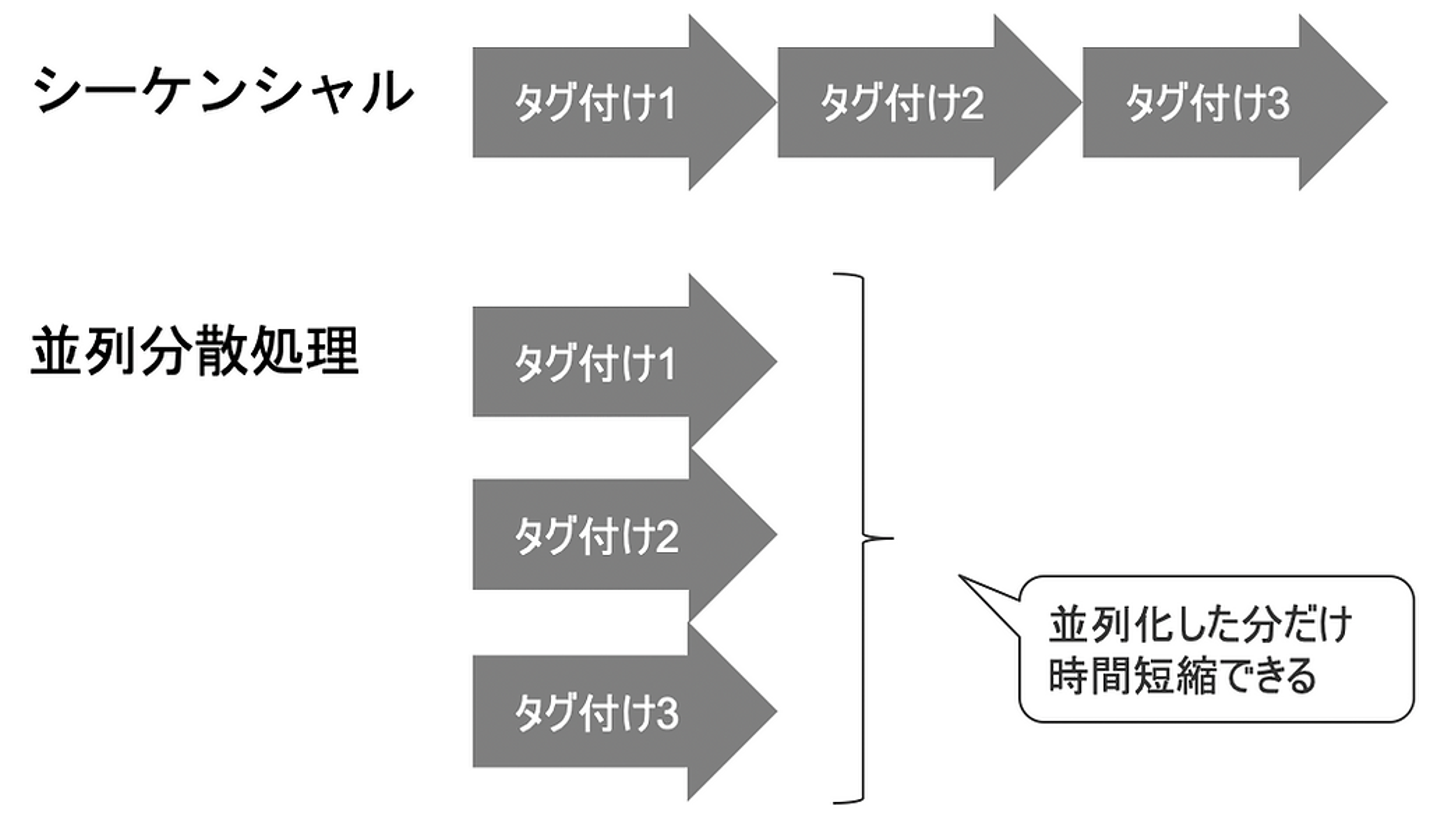 すべての画像に対してシーケンシャルにタグ付けすると時間内に処理が終わらないため、並列分散処理で時間短縮を試みました。
