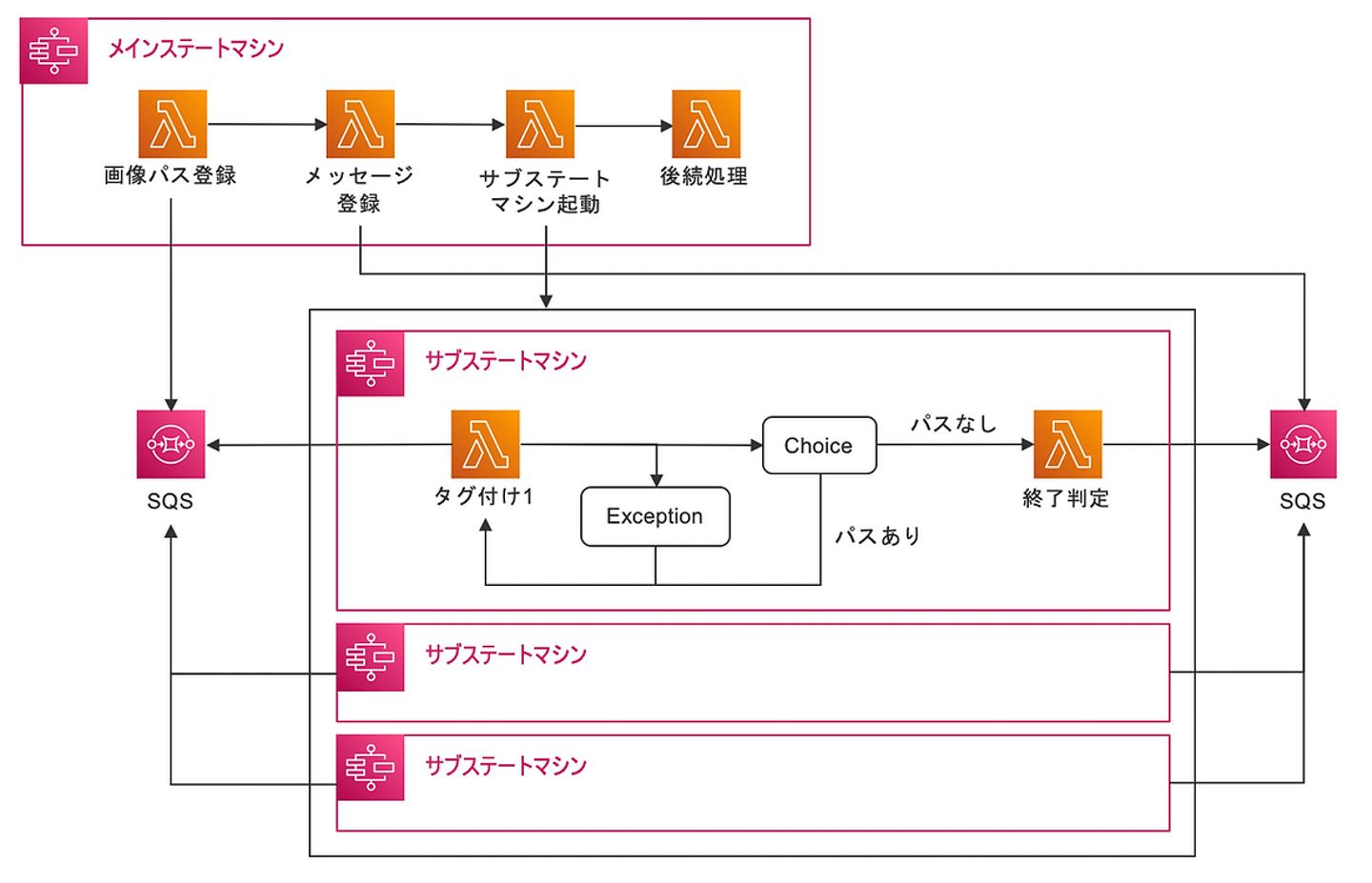 メインステートマシンに後続処理を、サブステートマシンにタグ付けのくり返しと終了判定を追加します。くり返しの条件は画像パスをSQSから取得できたかどうかで、取得できなければ終了判定を行います。