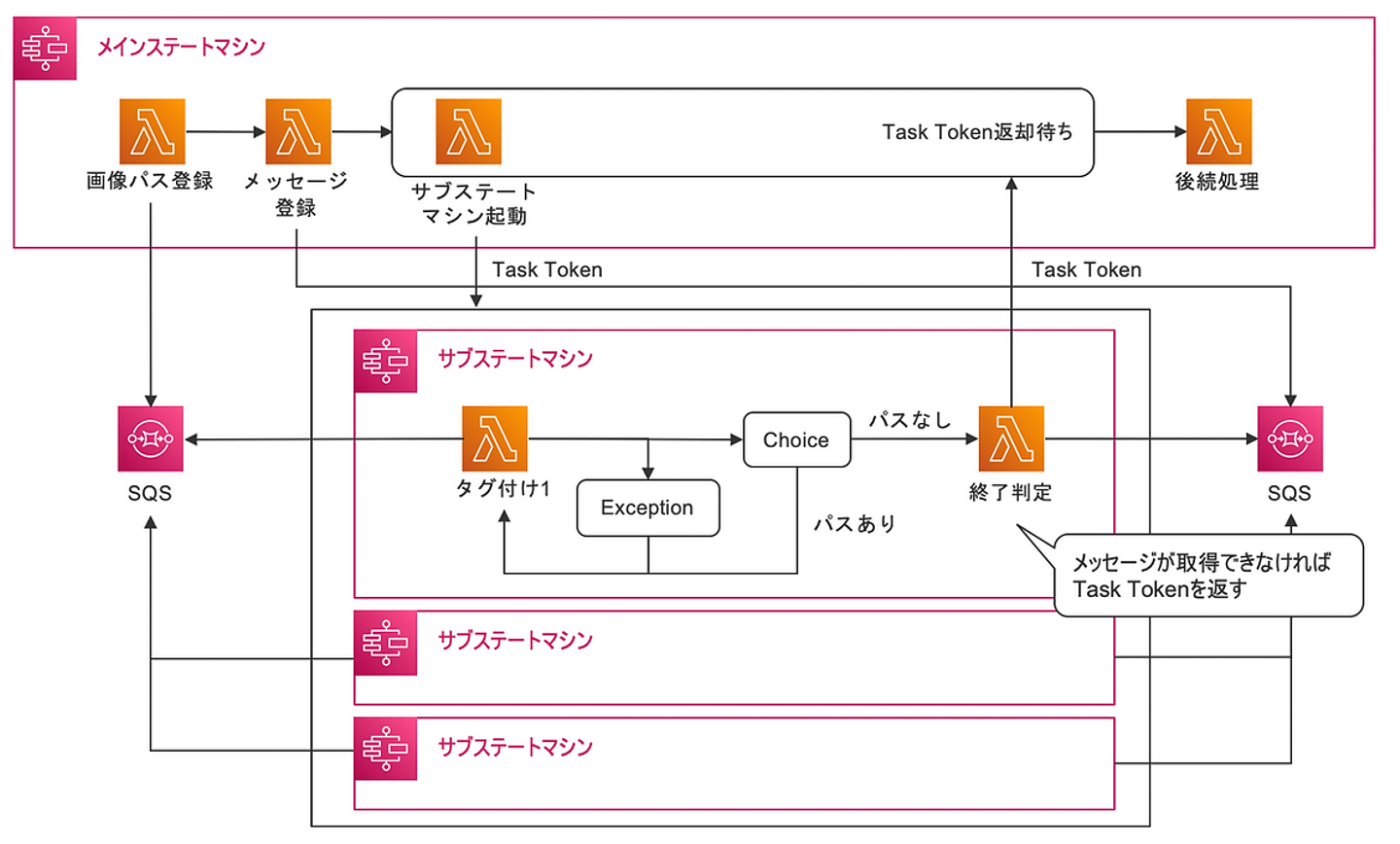 今回のケースでは、メインステートマシンから各サブステートマシンをTask Tokenを付けて呼び出し、タグ付け後、並列分散処理が終了したと判断したサブステートマシンがメインステートマシンにTask Tokenを返却することで実現しました。