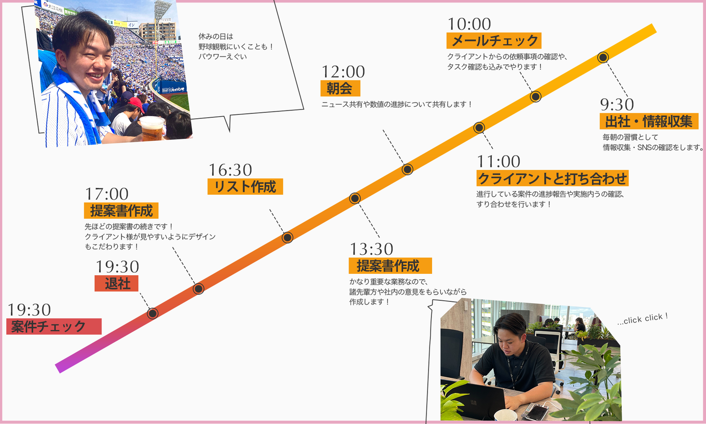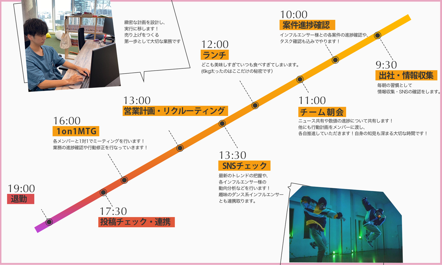 仕事内容は、インフルエンサー様向き合いで案件提案や稼働案件の管理、SNSトレンドのチェックやバズるための投稿分析などを行っております!