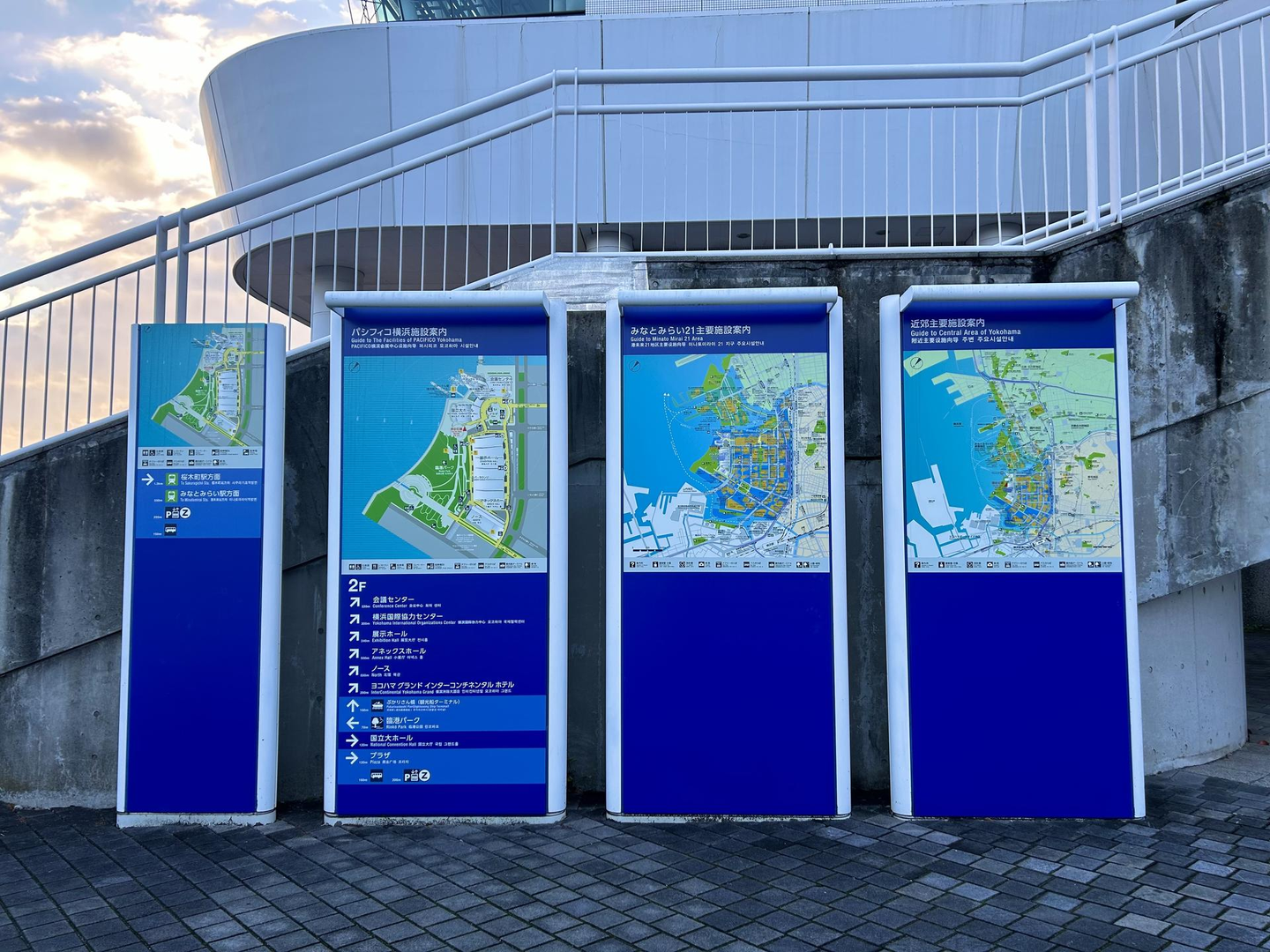 パシフィコ横浜のサインは、海沿いの環境に対応するため、表示基盤や支柱はサビにくいステンレスで設計されているニ!