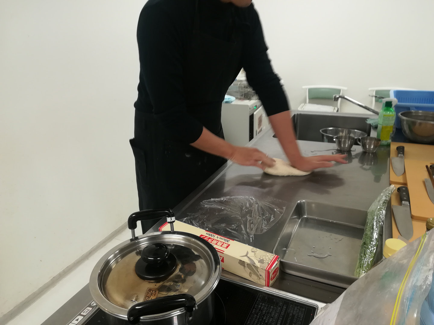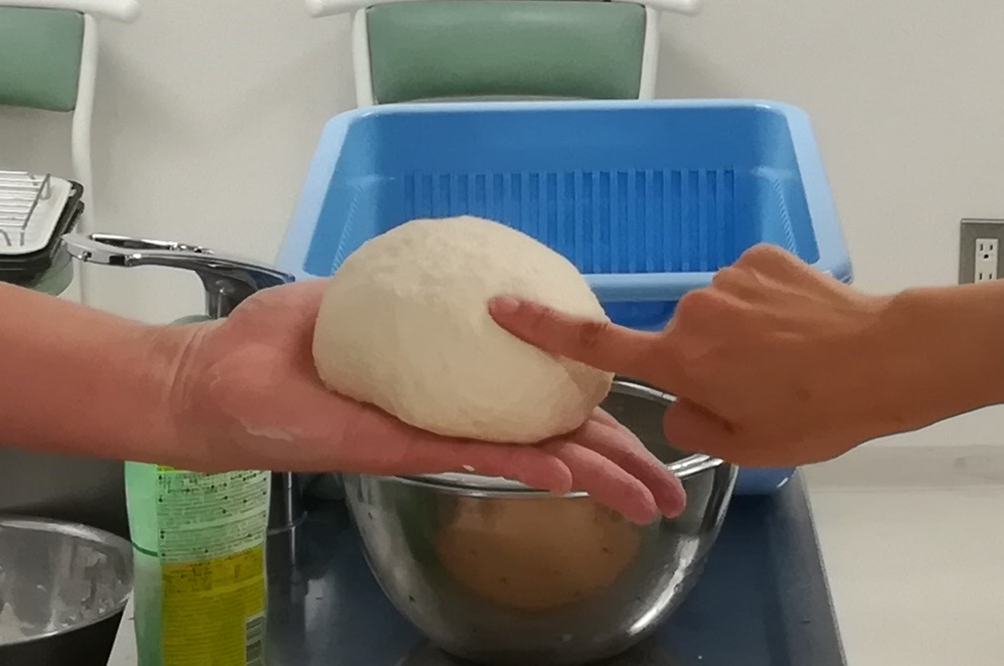 ↓私たちは、こねられた生地をぷにぷにしました(笑)