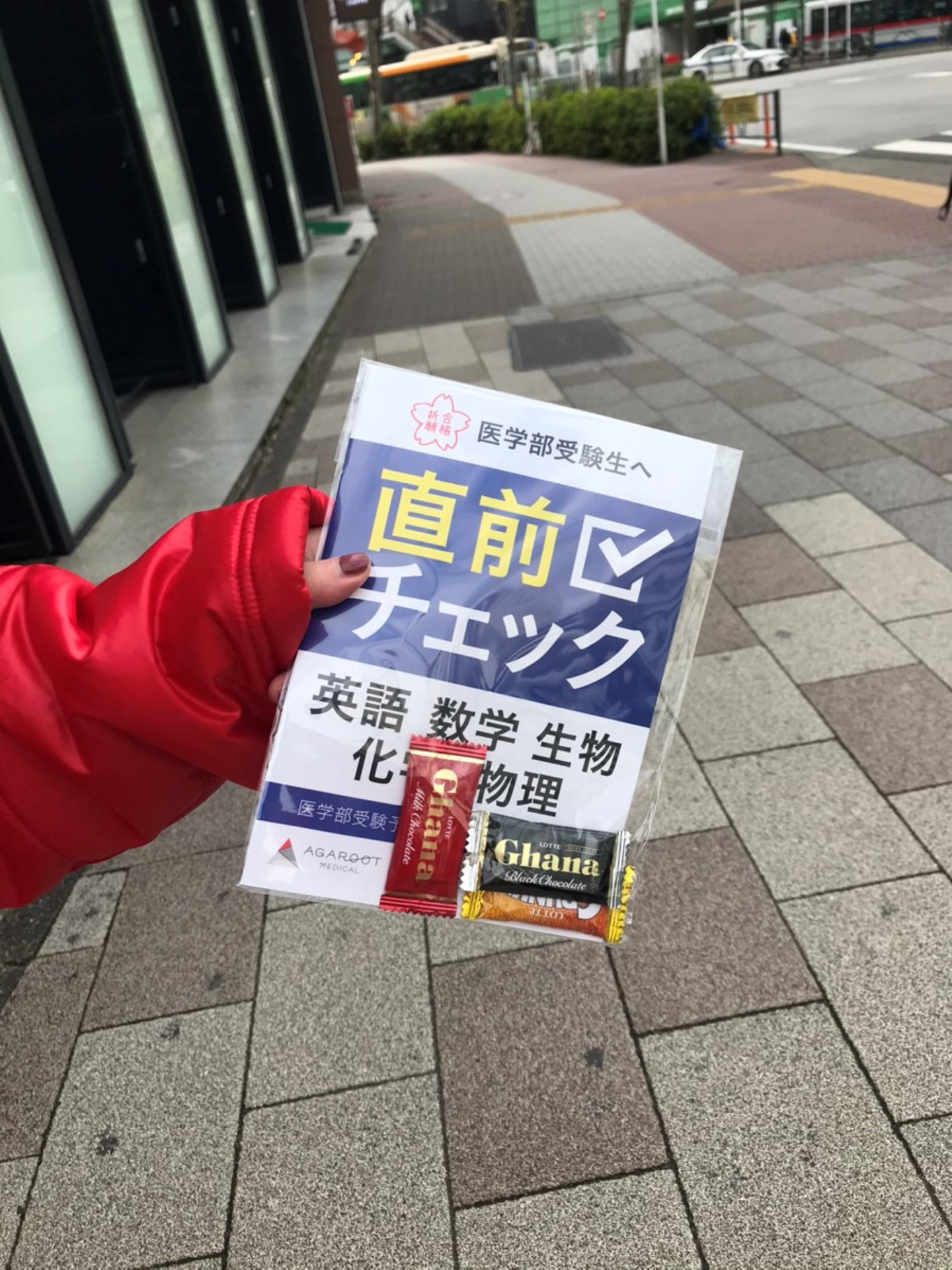 1月~3月にかけて、医学部予備校をより多くの方に知っていただくために、試験日に会場付近で、直前チェックのチラシ配布をしてきました。資格試験とは違い、朝がとっても早いです。7時半には、すでに他社予備校の方がたくさんいました!