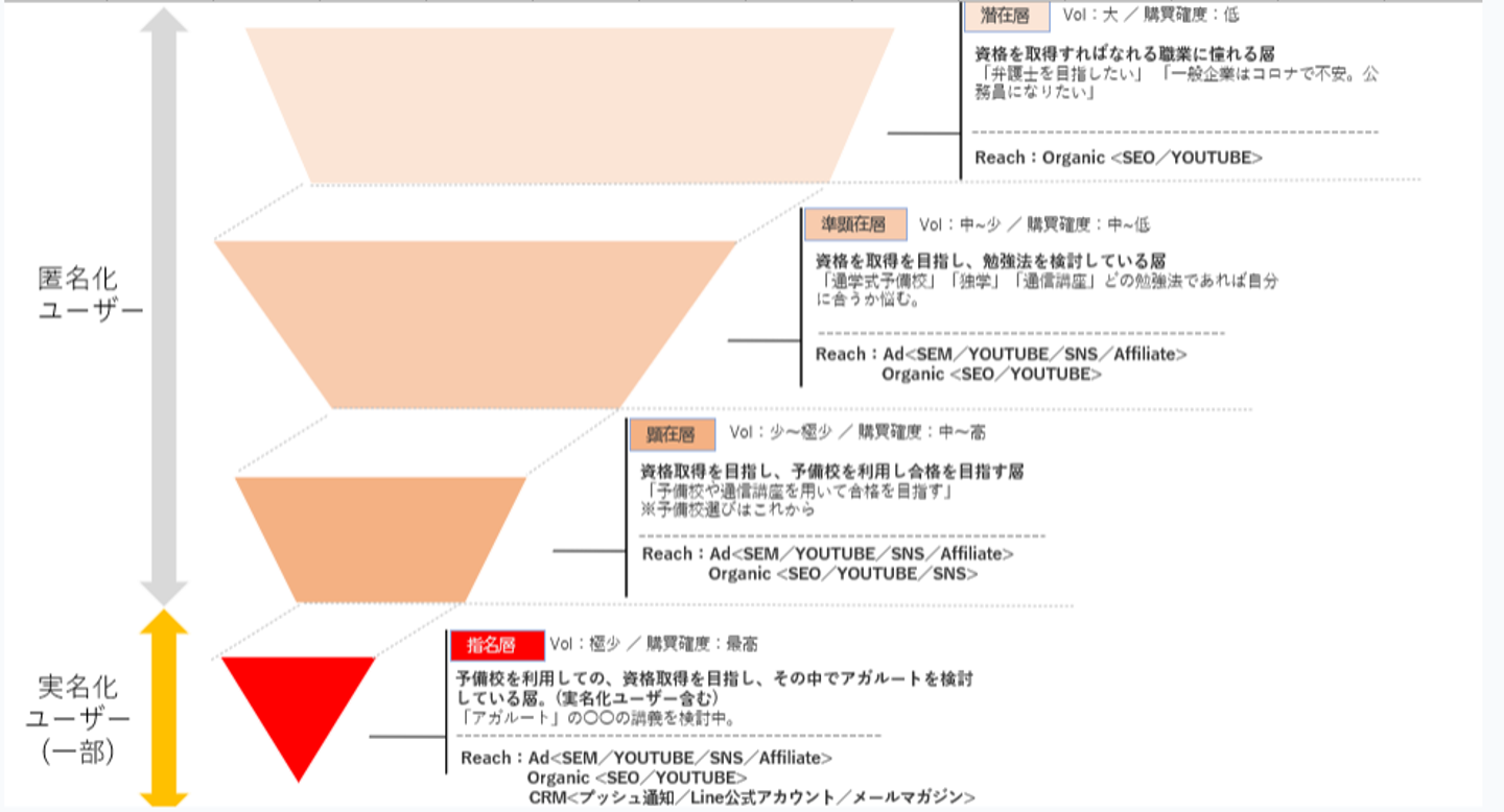 徐々に司法試験に関する興味付けを行い、ファネルを落としていくようなイメージです。
